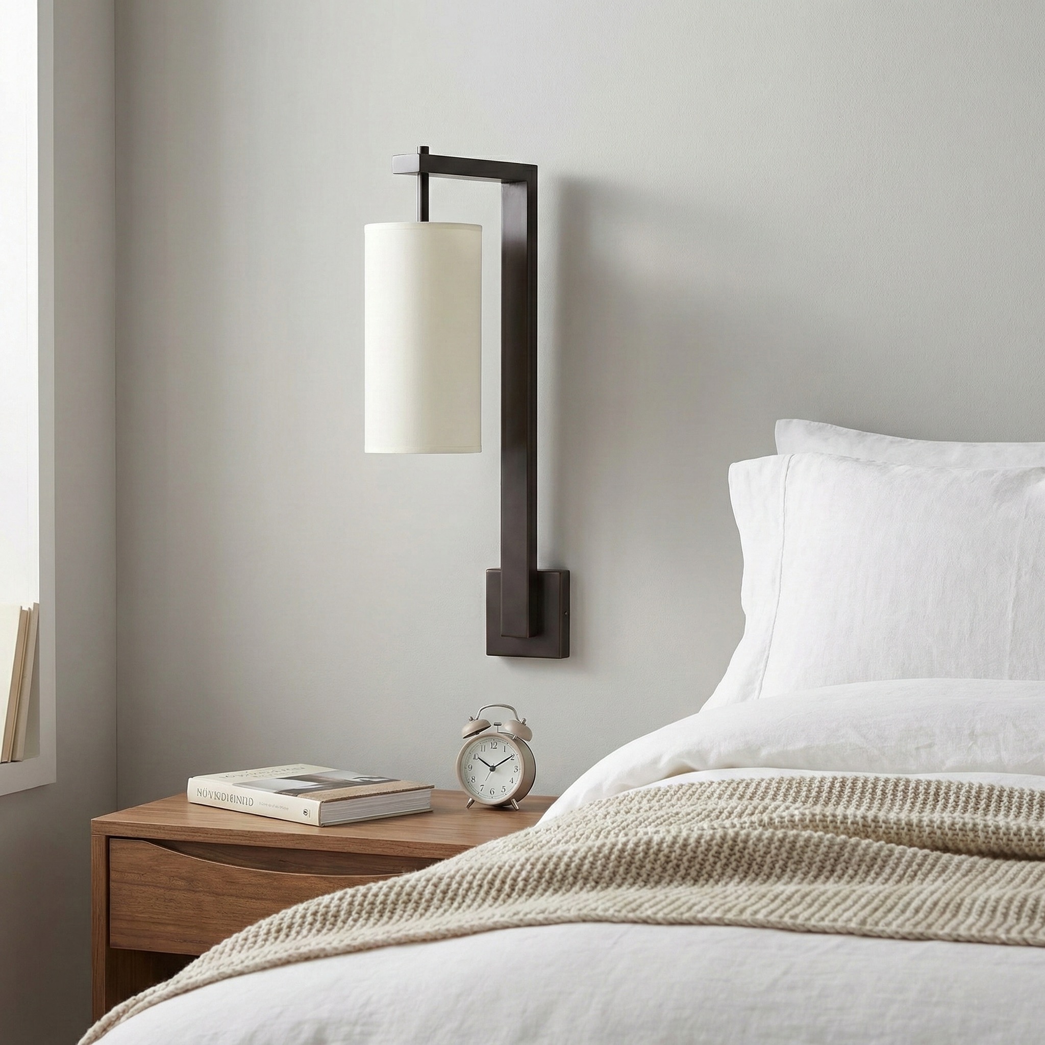 Aplique “Urbano Hook Negro” es la representación máxima del estilo industrial contemporáneo. Su estructura de hierro minimalista en acabado negro mate sostiene una pantalla cilíndrica de lino, creando un contraste visual potente entre la rigidez del metal y la calidez del tejido. Su diseño estilizado y vertical es la solución perfecta para iluminar con elegancia espacios de altura, lofts, o para ser utilizado como luz de mesa de noche suspendida, ahorrando espacio con gran estilo.