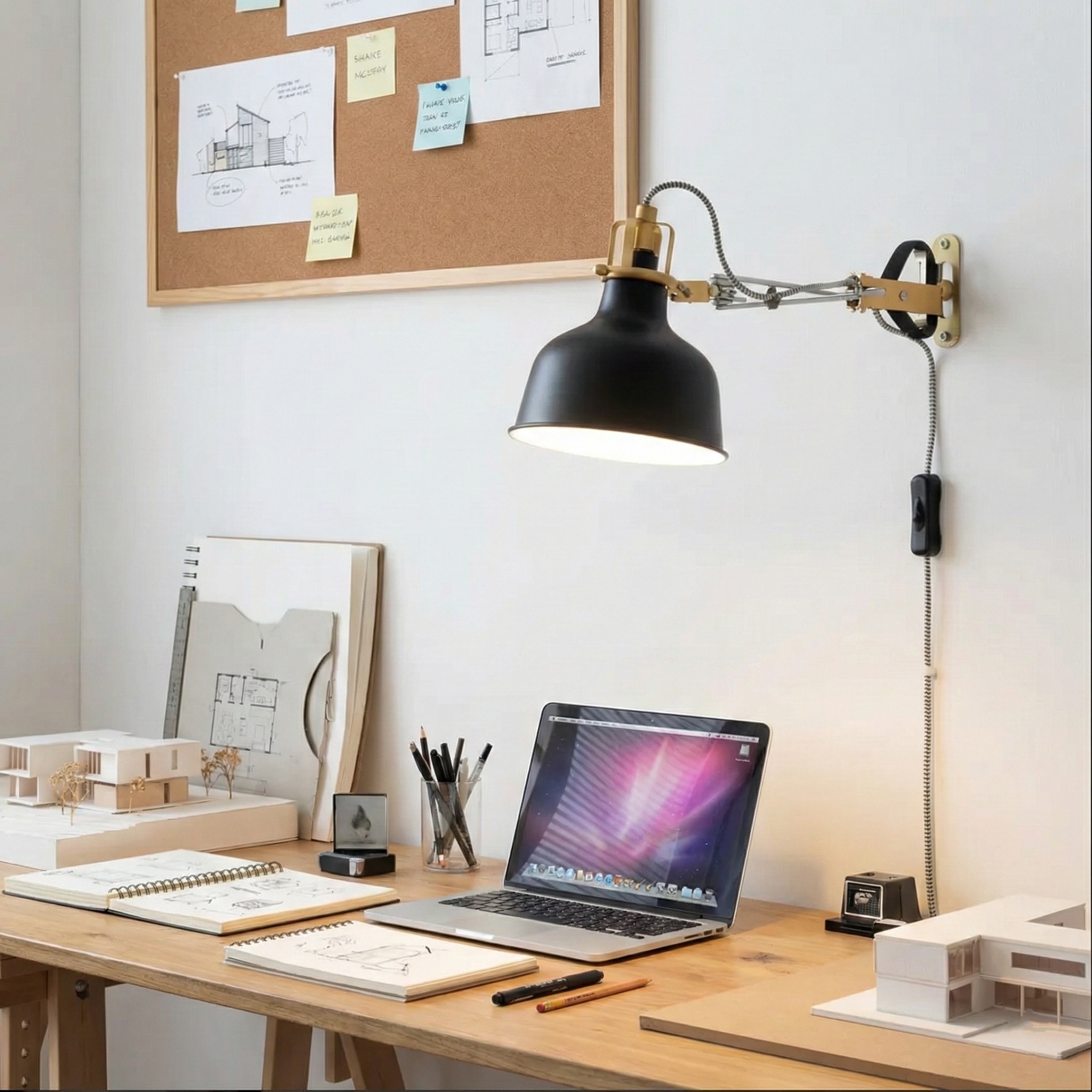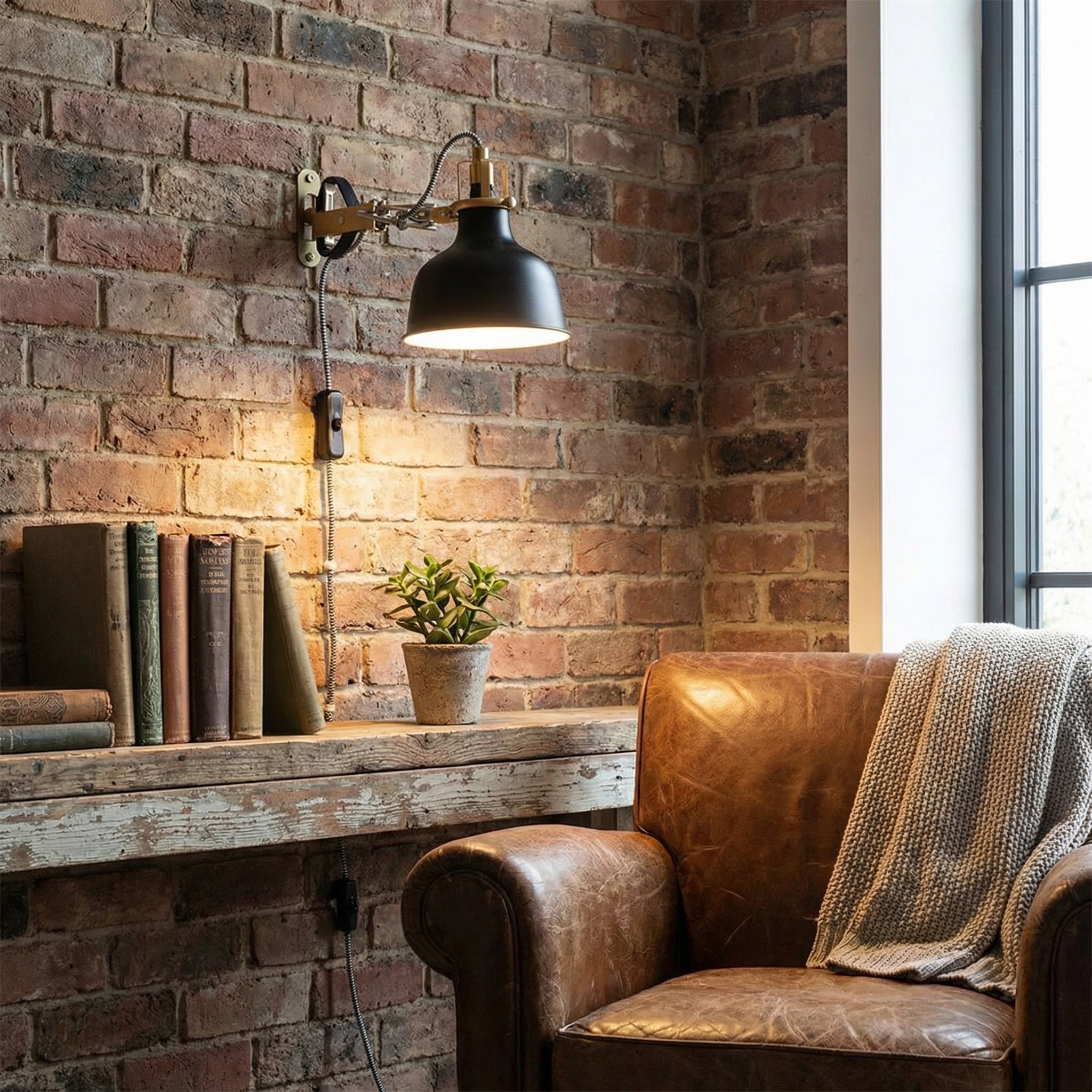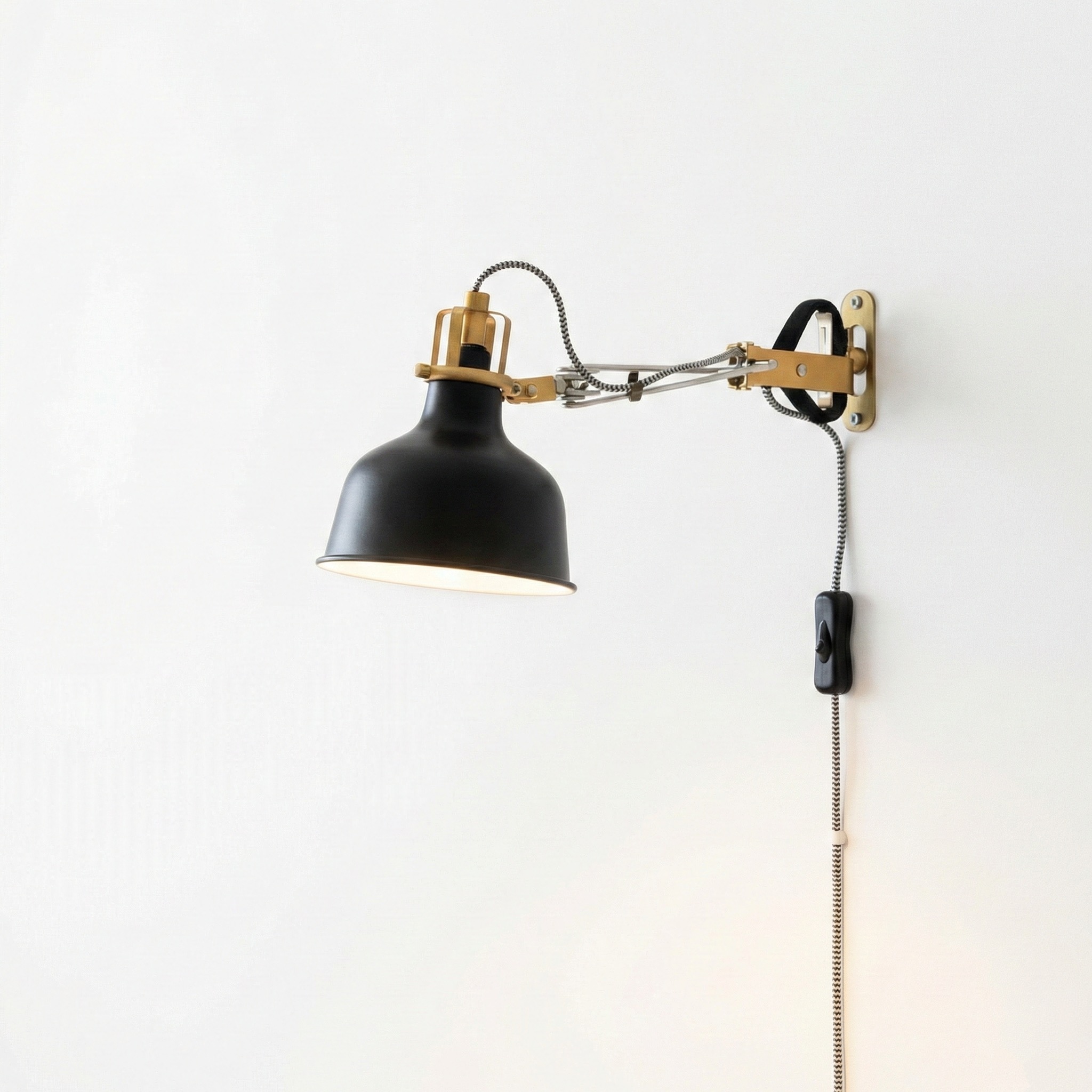 Su diseño combina una pantalla tipo domo en negro mate con herrajes y detalles de articulación en oro satinado, logrando un contraste sofisticado y de gran impacto visual. Incluye un cable exterior textil con interruptor integrado, lo que facilita su instalación en cualquier rincón sin necesidad de realizar obras internas en la pared. Es la solución ideal para escritorios, talleres creativos o como una lámpara de lectura dinámica en dormitorios de estilo industrial o rústico.