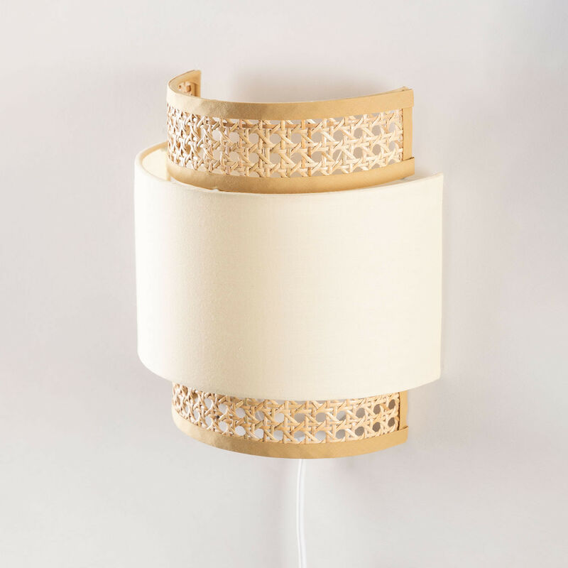 nuestro aplique de pared mixto, una obra maestra confeccionada a mano con exquisitas terminaciones. Su diseño combina telas finas y fibras naturales, creando una fusión perfecta que aporta un toque vivo, fresco y natural a tu espacio. Además, viene completa con portalámparas, cable y florón, listos para ser instalados. Ilumina tu hogar con estilo y distinción con esta magnífica pieza.