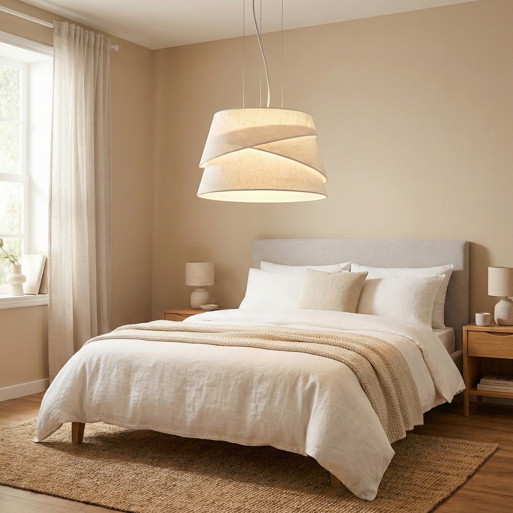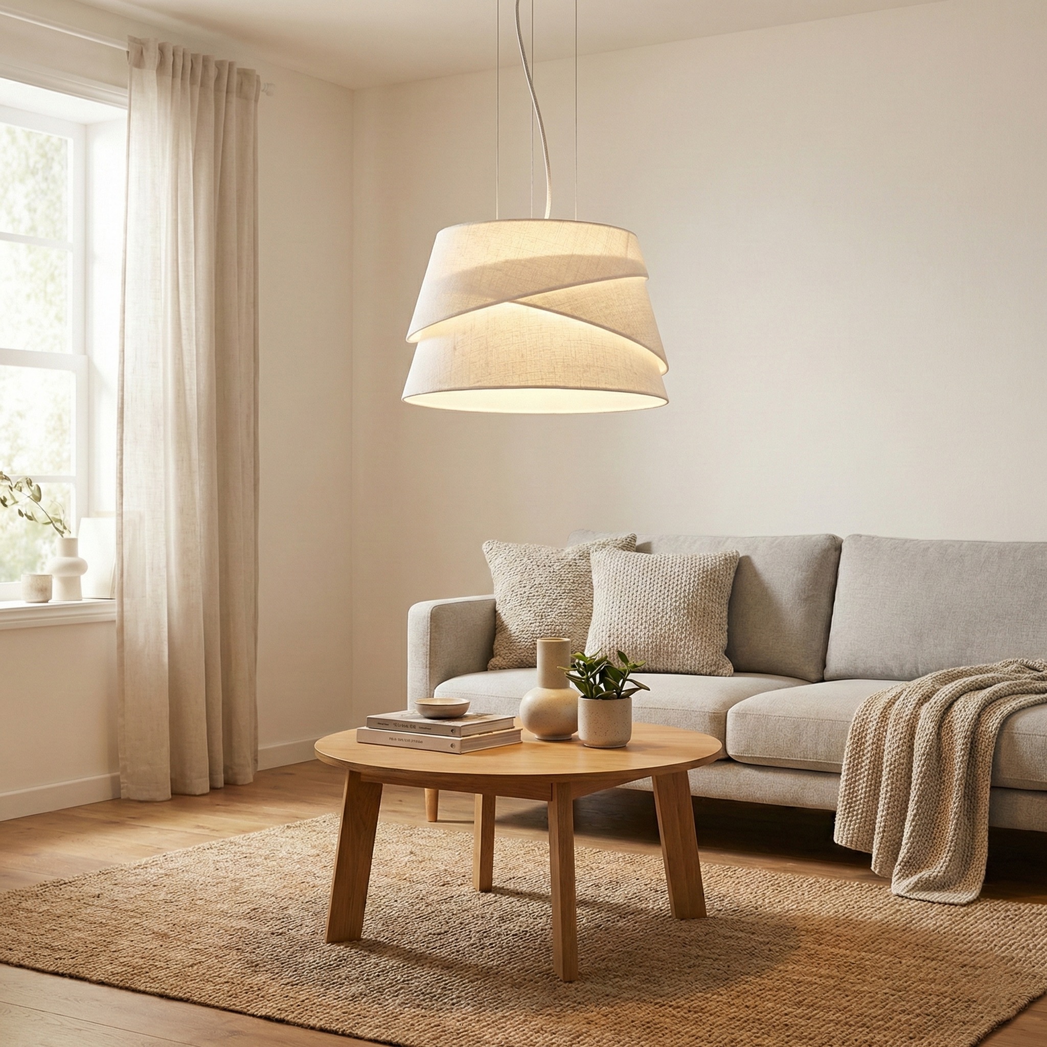El Colgante “Aura Envolvente Lino” es una pieza de diseño contemporáneo que reinterpreta la clásica pantalla cónica mediante un juego de capas superpuestas. Su estructura escalonada en espiral crea un volumen dinámico que tamiza la luz de forma gradual, eliminando sombras duras y transformando cualquier habitación en un espacio de serenidad. Es la luminaria ideal para protagonizar comedores, dormitorios principales o salas de estar que busquen un equilibrio entre el minimalismo moderno y la calidez de las fibras naturales.