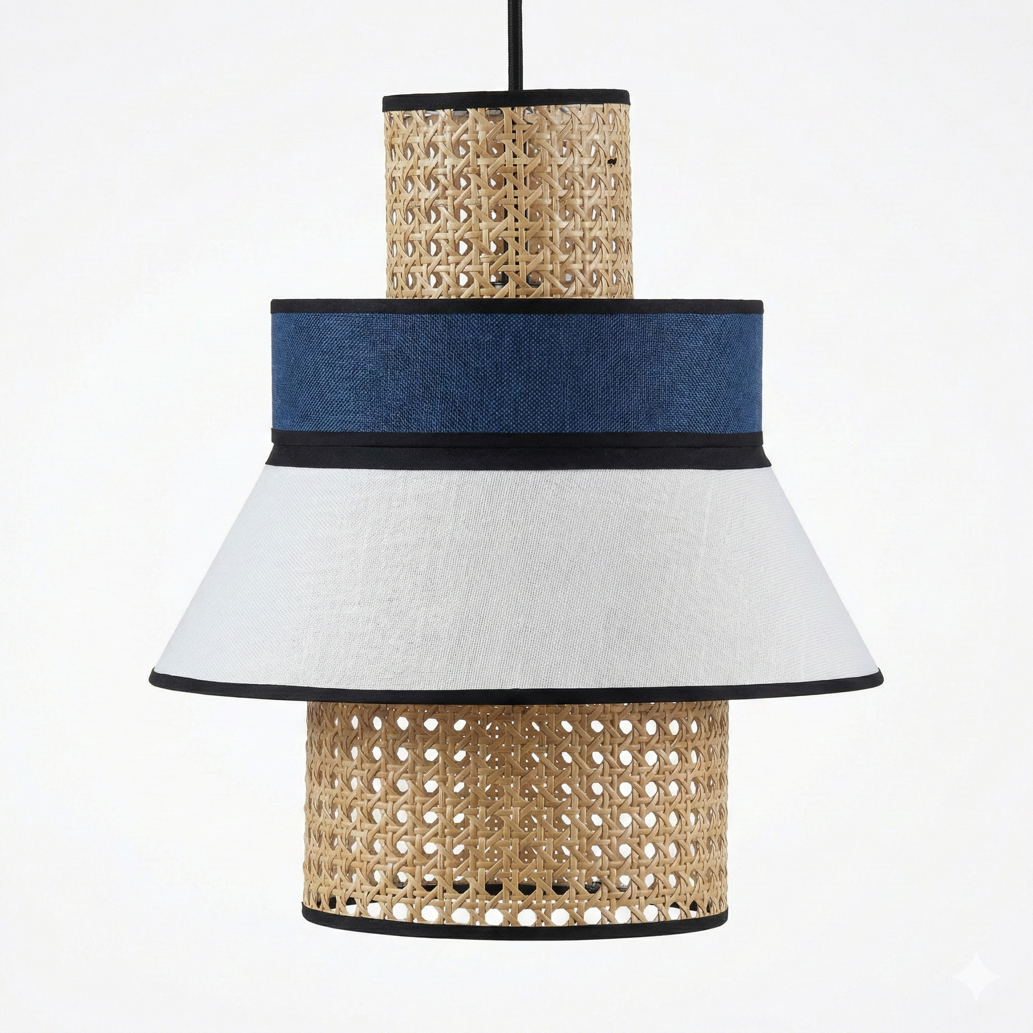 El Colgante “Chroma Quad Navy” es una pieza de iluminación de gran porte que evoca la frescura de los ambientes mediterráneos y costeros. Su estructura escalonada de cuatro niveles alterna cilindros de esterilla de caña natural con bandas de tela premium en color azul navy y blanco óptico. Los ribetes en bies negro definen con precisión cada nivel, aportando una terminación técnica que eleva el diseño artesanal, convirtiéndola en la luminaria ideal para residencias de verano, comedores principales o espacios sociales con una impronta náutica refinada.