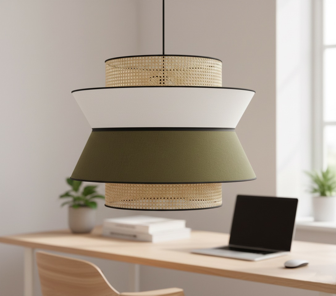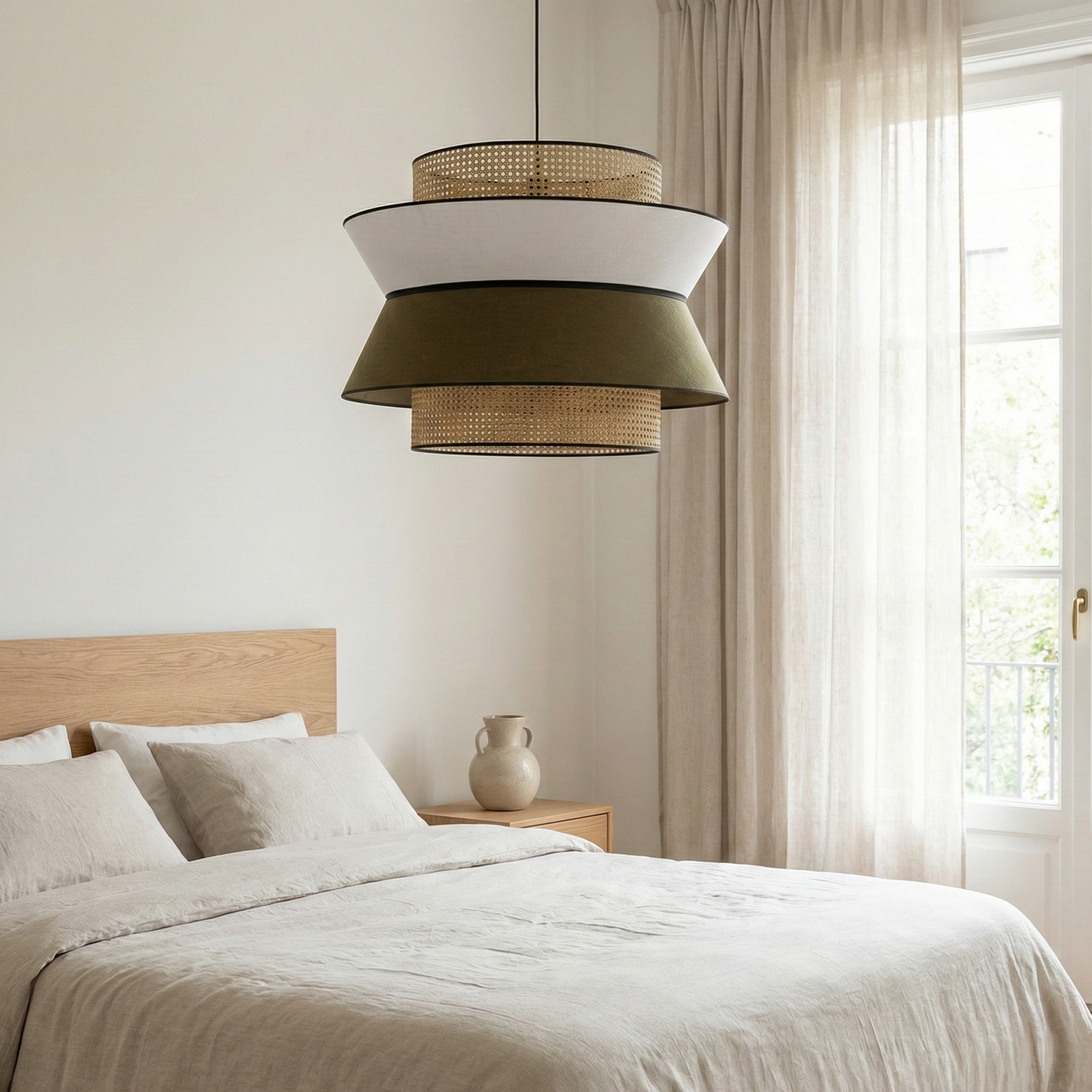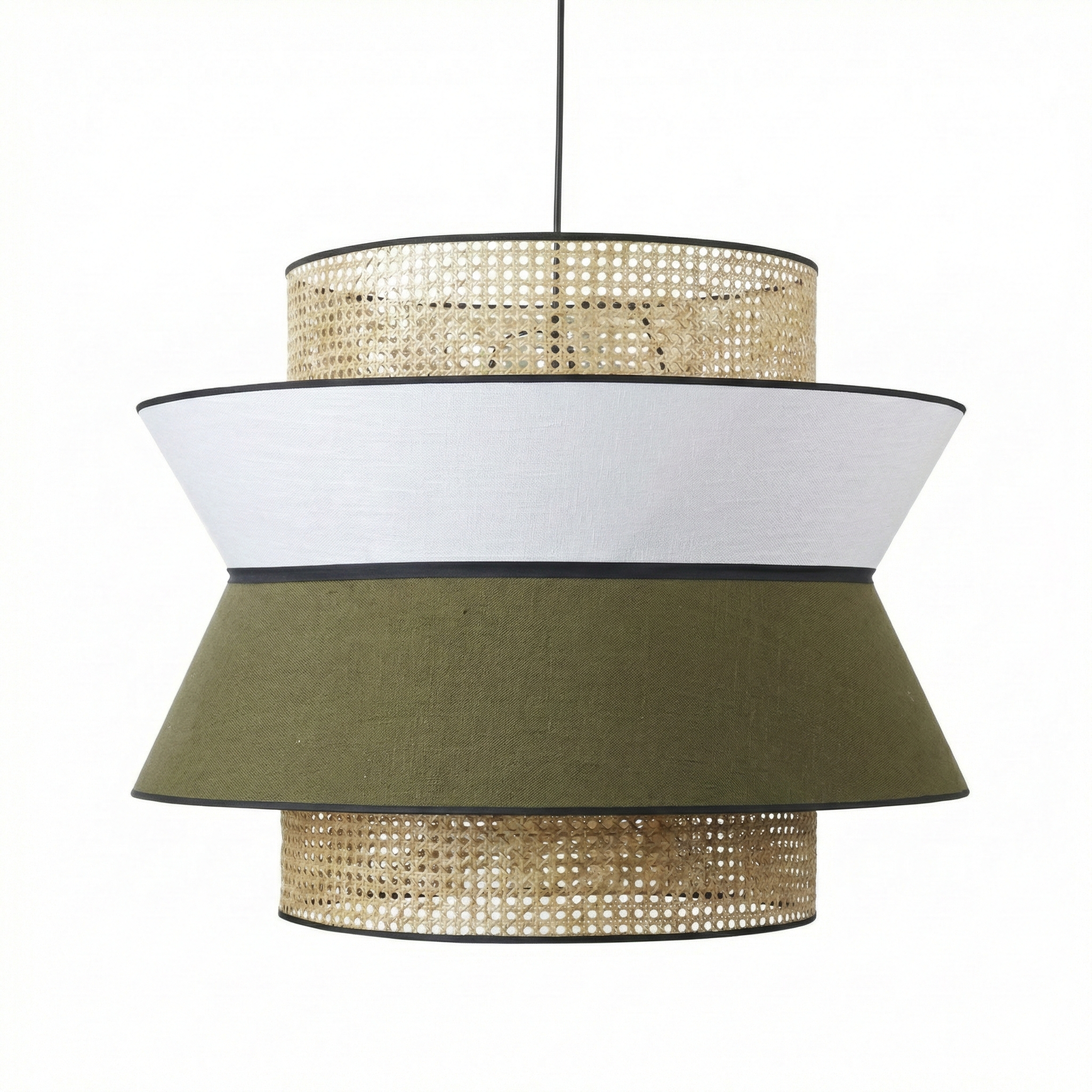 El Colgante “Chroma Quad Olive” es la pieza definitiva para quienes buscan una iluminación con gran impacto visual y calidad artesanal. Su compleja estructura de cuatro niveles combina cilindros de esterilla de caña natural en los extremos con dos bandas centrales de tela premium en blanco óptico y verde oliva. Los ribetes en bies negro definen cada sección, aportando una terminación técnica y moderna que jerarquiza cualquier comedor, hall de entrada o dormitorio principal de alta gama.