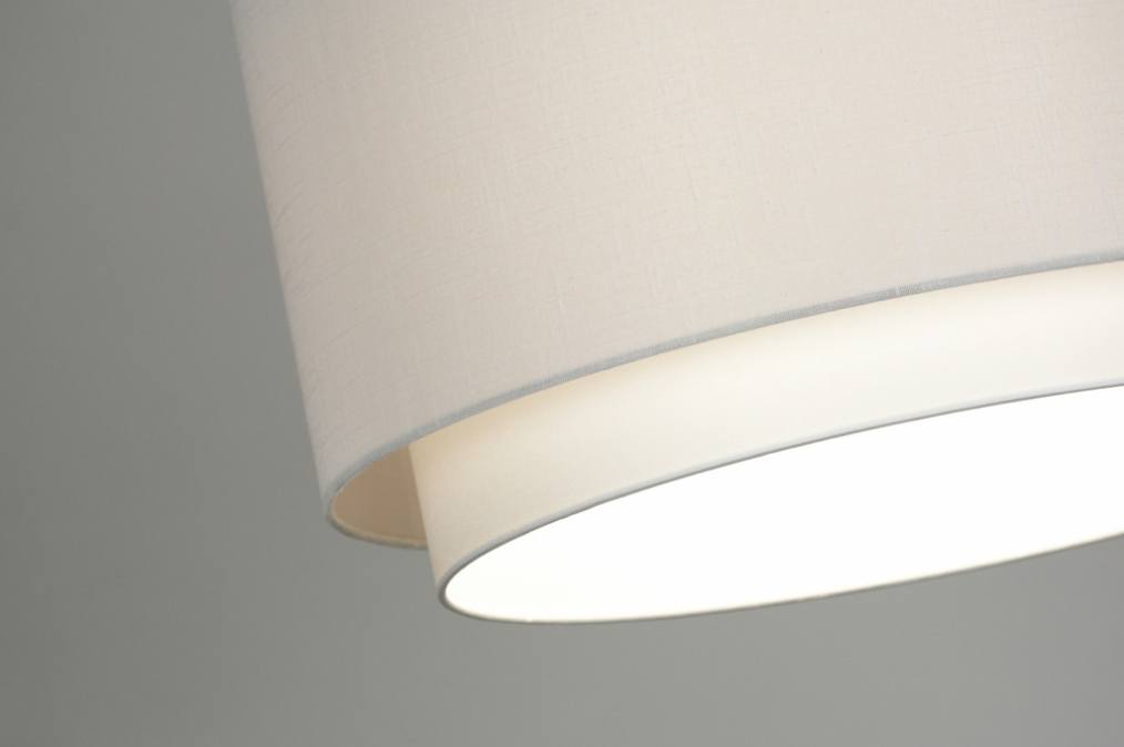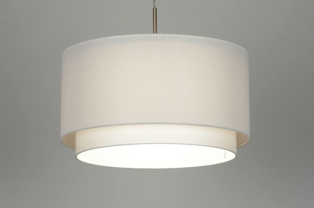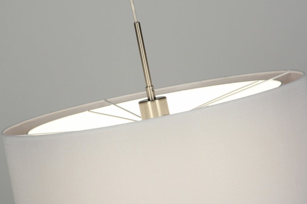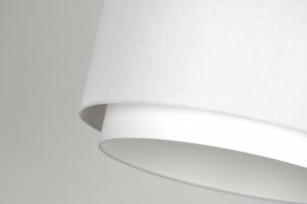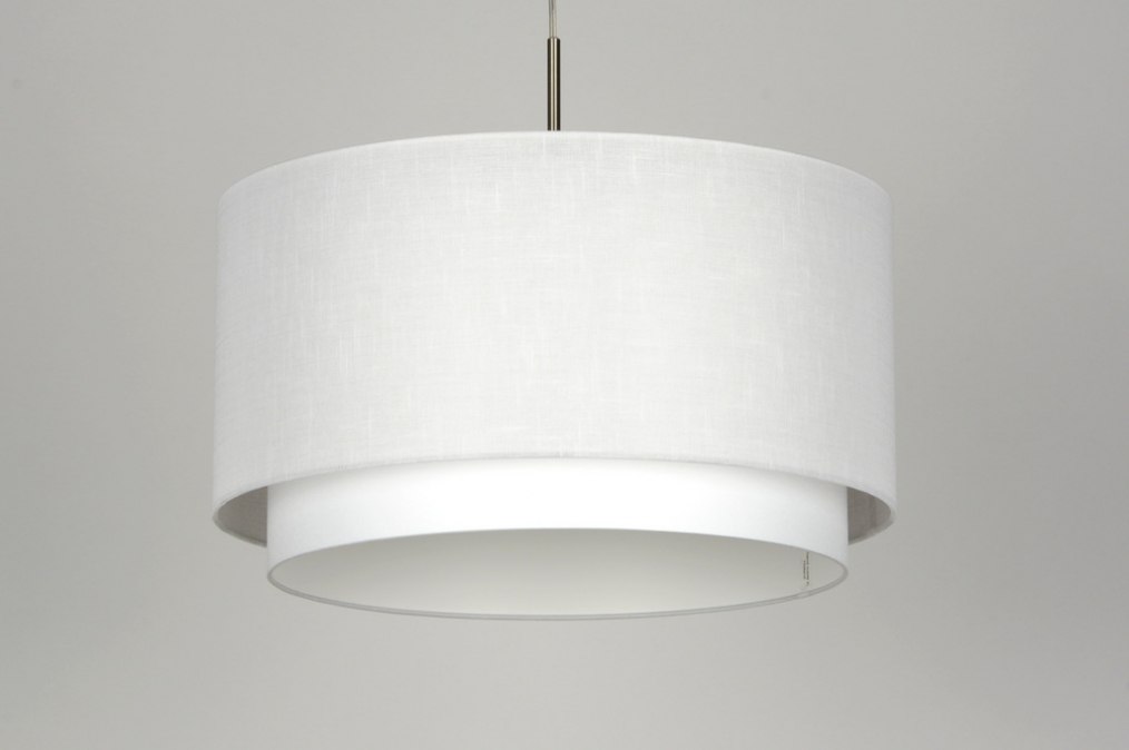 Una atmosférica lámpara colgante con doble de pantalla. La pantalla exterior tiene una textura de tela de color blanco y la estructura es de lino. Debido esta sustancia es algo más grueso y deja más luz a través de la pantalla. La pantalla interior es blanca y tiene una textura más fina y tiene una tela suave agradable. Debido a esta sustancia es más fina y más densa la pantalla en el interior y que se mantenga la luz más. Esto genera una luz clara en la parte inferior. La pantalla exterior crea un efecto atmosférico. La placa del techo está realizado en acero.