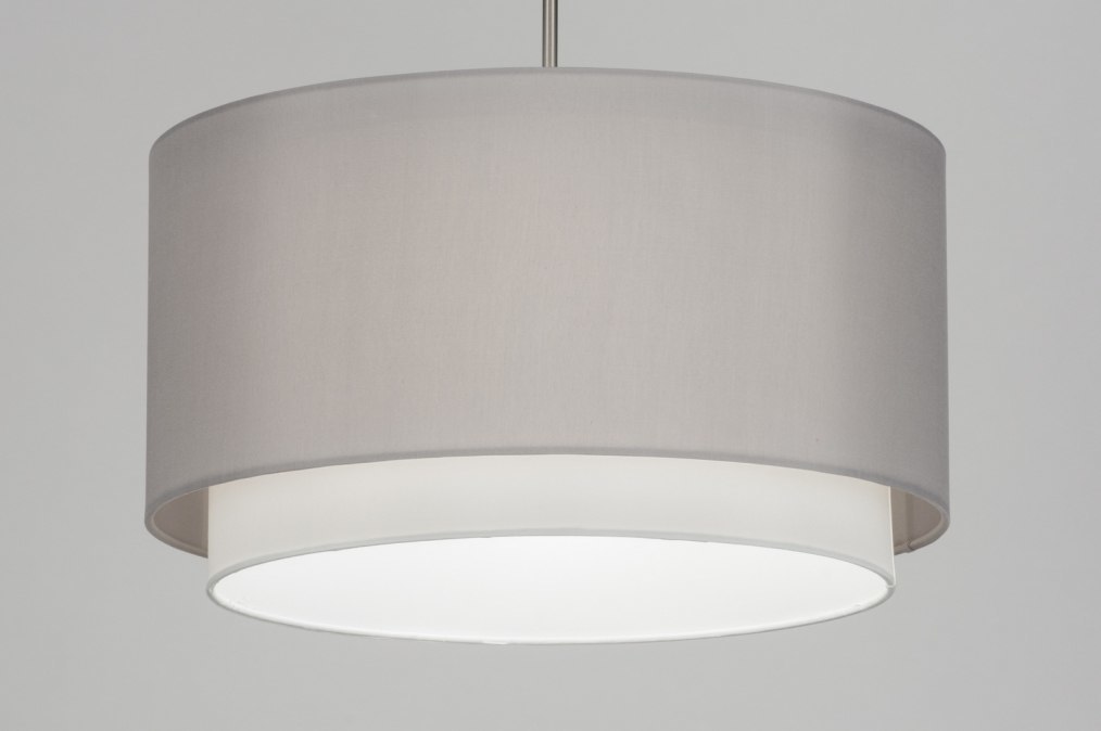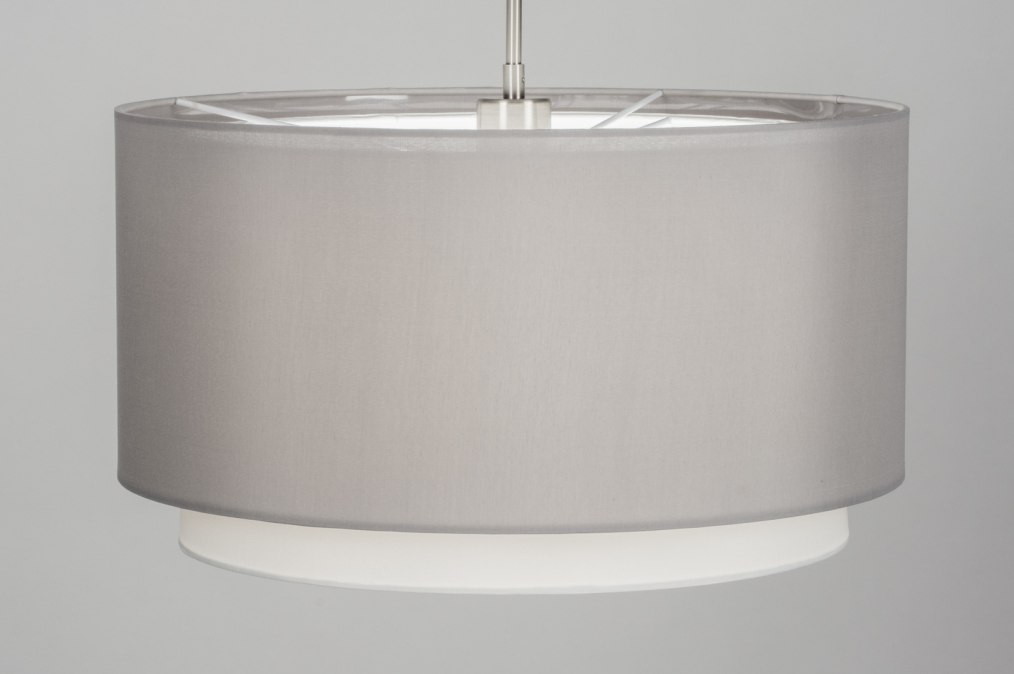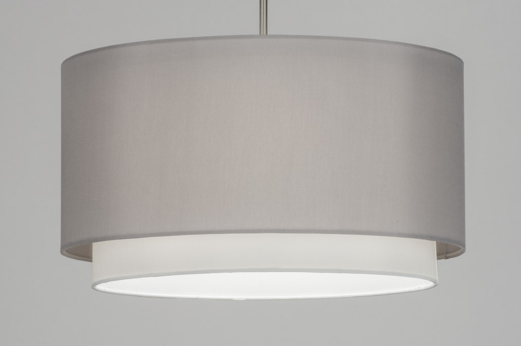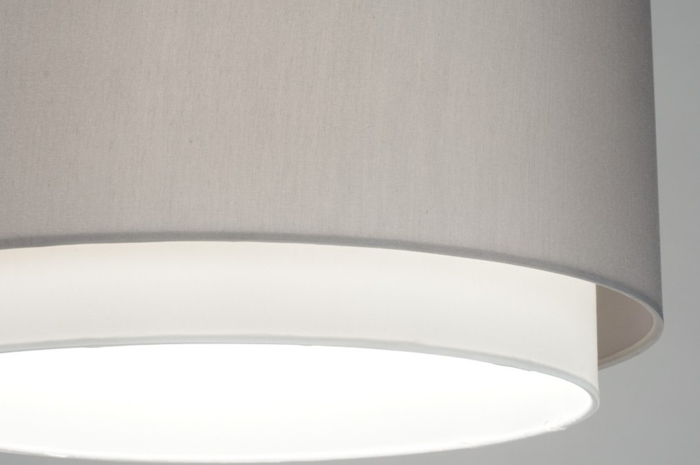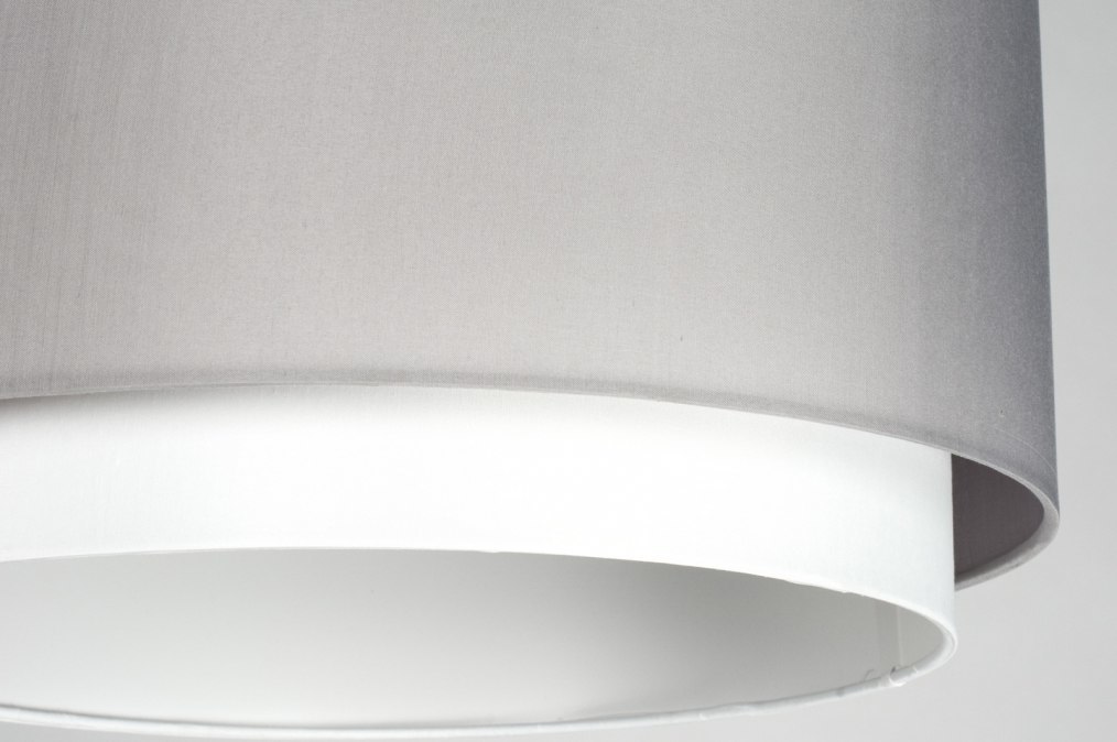 Una lámpara elegante colgante con doble de pantalla de tela. Esta lámpara consiste con dos pantallas que caen una sobre la otra. La pantalla exterior tiene un color gris oscuro y la tela tiene una textura de lino. Debido a que esta sustancia es ligeramente más grueso que dejar que cubre más luz. La pantalla blanca interna es de textura más fina, agradable y suave. Debido a que está sustancia es más fina y más densa la pantalla interior se mantenga la luz más. La pantalla exterior proporciona un efecto atmosférico. La placa de techo está hecho de acero.