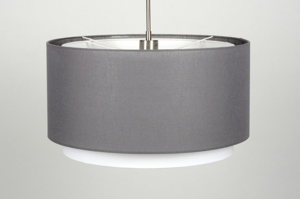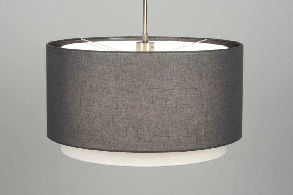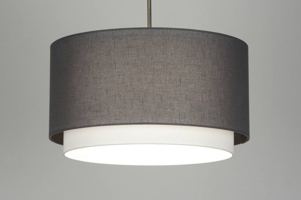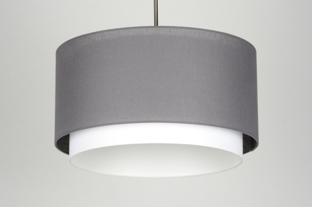 Una lámpara elegante colgante con doble de pantalla de tela. Esta lámpara consiste con dos pantallas que caen una sobre la otra. La pantalla exterior tiene un color gris oscuro y la tela tiene una textura de lino. Debido a que esta sustancia es ligeramente más grueso que dejar que cubre más luz. La pantalla blanca interna es de textura más fina, agradable y suave. Debido a que está sustancia es más fina y más densa la pantalla interior se mantenga la luz más. La pantalla exterior proporciona un efecto atmosférico.