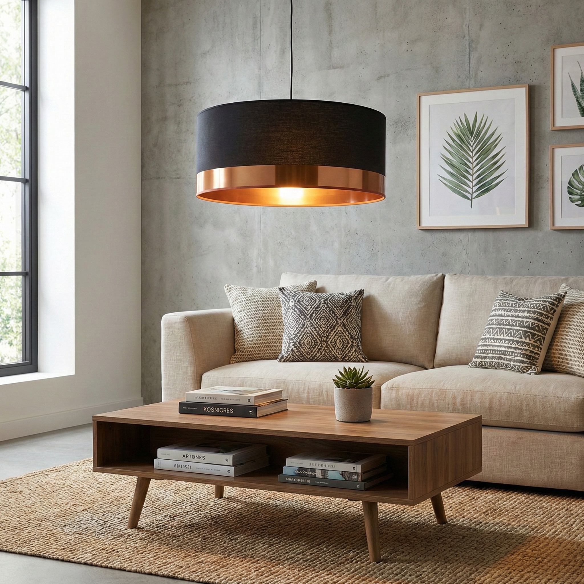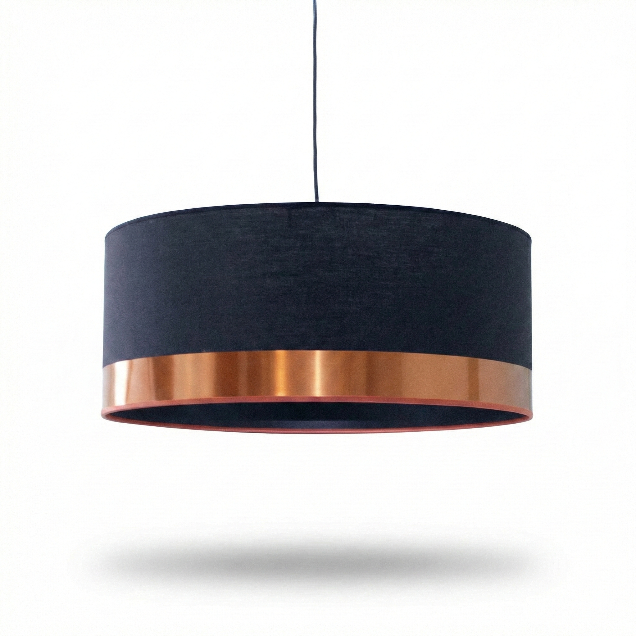 El Colgante “Duo Lux Copper” es la pieza definitiva para ambientes que buscan un equilibrio entre lo industrial y lo sofisticado. Su diseño cilíndrico se destaca por un cuerpo principal en tela de algodón negro mate de alta densidad, rematado en su borde inferior por una impactante faja metálica en acabado cobre brillante. Esta combinación no solo aporta un toque de glamour contemporáneo, sino que ayuda a proyectar una luz cálida y dirigida, ideal para jerarquizar barras de cocina, comedores modernos o mesas de reunión.