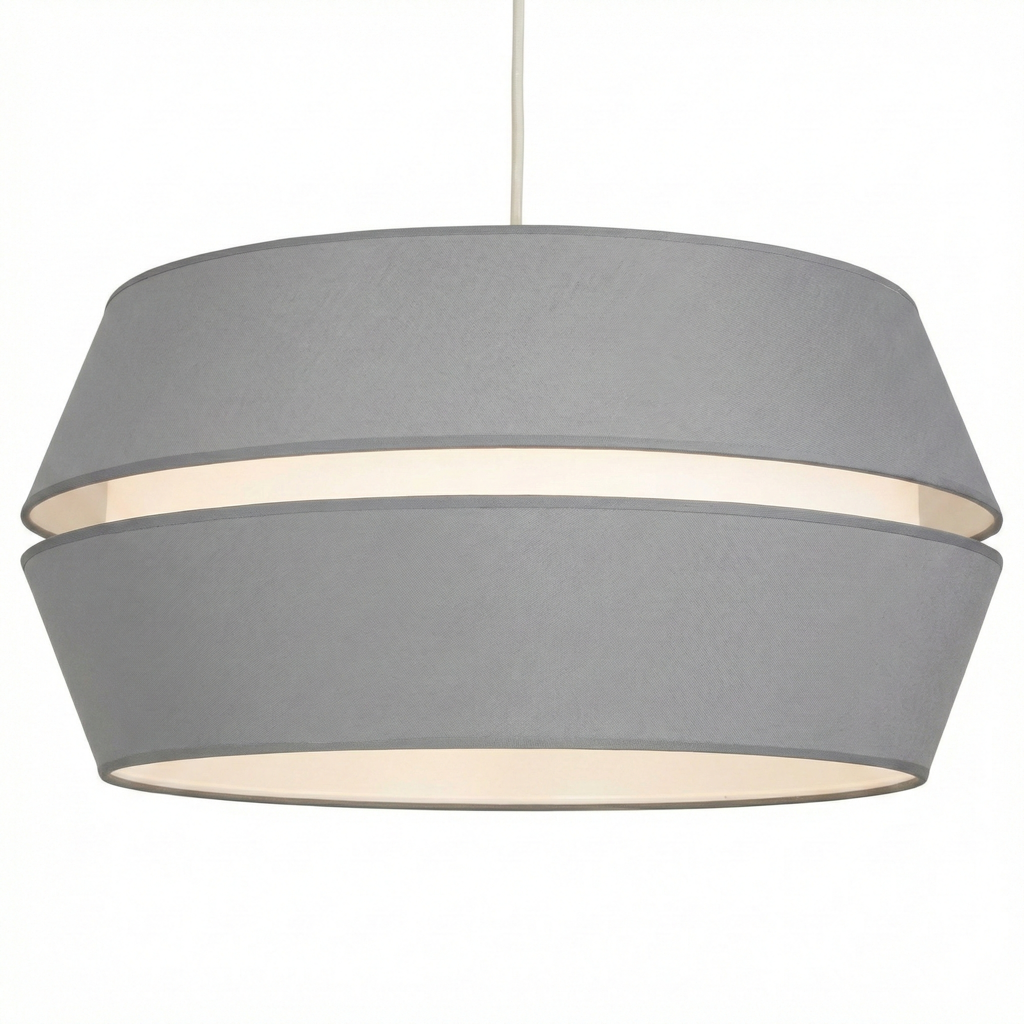 El Colgante “Duo Split Grey” es una pieza de iluminación que juega con la geometría y los vacíos. Su diseño se compone de dos pantallas cónicas de tela enfrentadas, separadas por una ranura central que permite una fuga de luz perimetral sumamente elegante. Esta luminaria de gran porte es ideal para ambientes que buscan un equilibrio entre el minimalismo arquitectónico y la calidez textil, siendo perfecta para jerarquizar comedores, livings o estudios modernos.