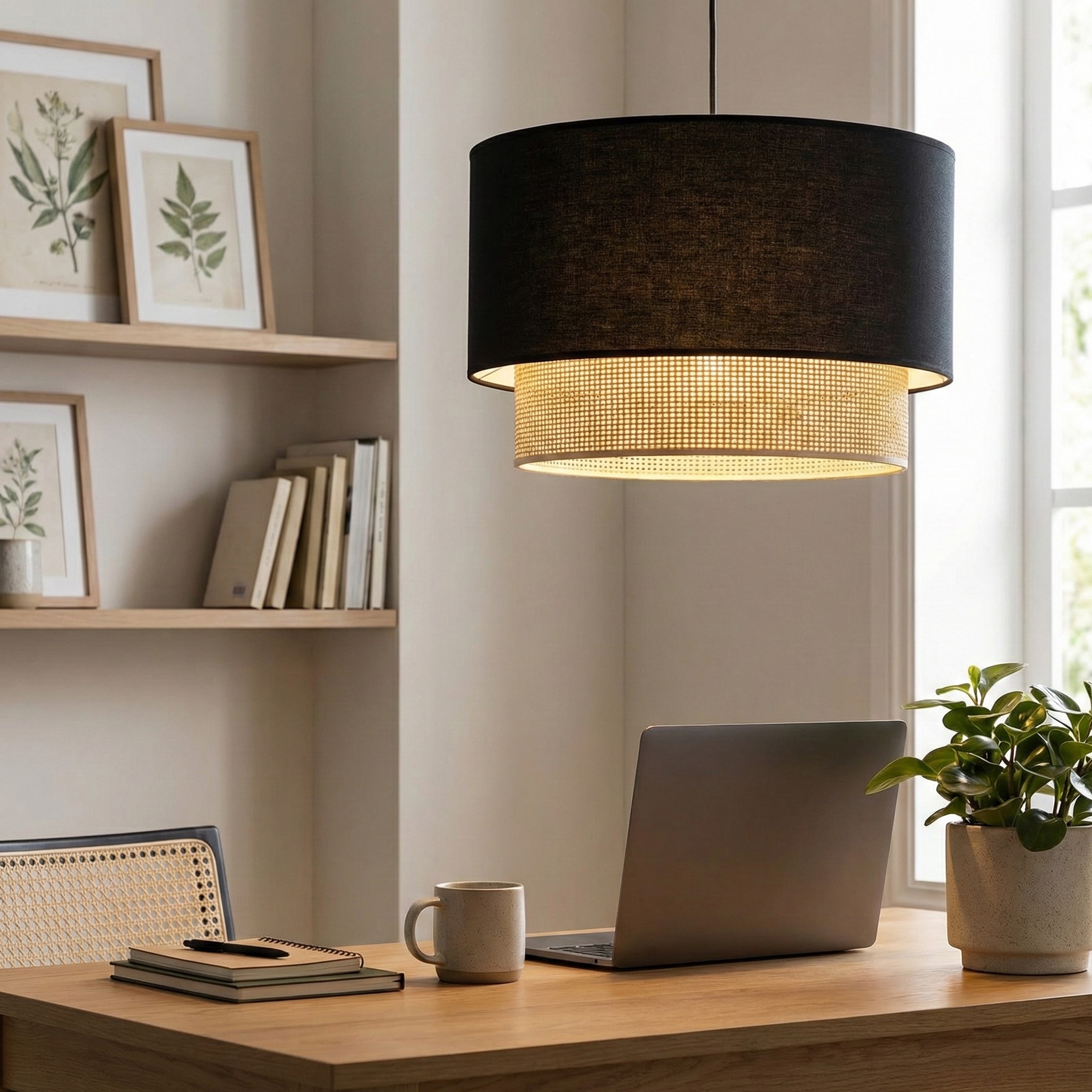 El Colgante “Duo Texture Black” es una pieza de diseño contemporáneo que utiliza el contraste para generar un impacto visual sofisticado. Su estructura se compone de dos niveles cilíndricos: un nivel superior de mayor diámetro en tela de algodón negro mate y un nivel inferior en esterilla de caña natural tejida. Esta combinación permite una iluminación dual, donde la parte superior contiene la luz de forma focalizada mientras que la base de fibra filtra un resplandor cálido y rítmico, ideal para comedores, barras de cocina o livings con una estética moderna-bohemia.