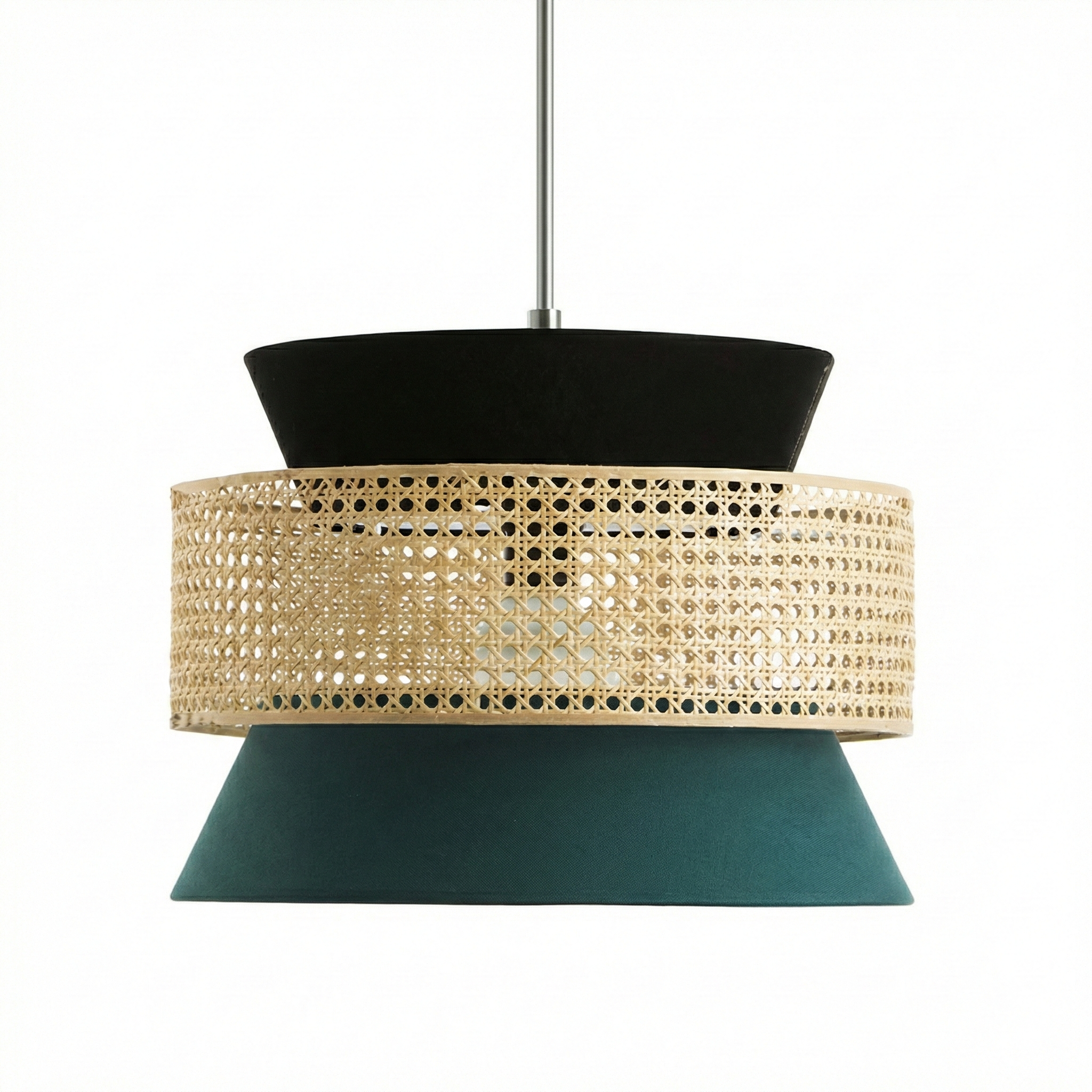 El Colgante “Trio Chroma Rattan” es una pieza de iluminación suspendida que logra un equilibrio perfecto entre la sofisticación moderna y la calidez artesanal. Su estructura de tres niveles se compone de un cilindro superior en tela negra de alta densidad, una banda central de esterilla de caña natural tejida y un nivel inferior en tela de color verde azulado (teal). Esta combinación de texturas y colores genera una iluminación rítmica y acogedora, convirtiéndola en el foco visual ideal para comedores contemporáneos, dormitorios principales o espacios con una estética ecléctica.