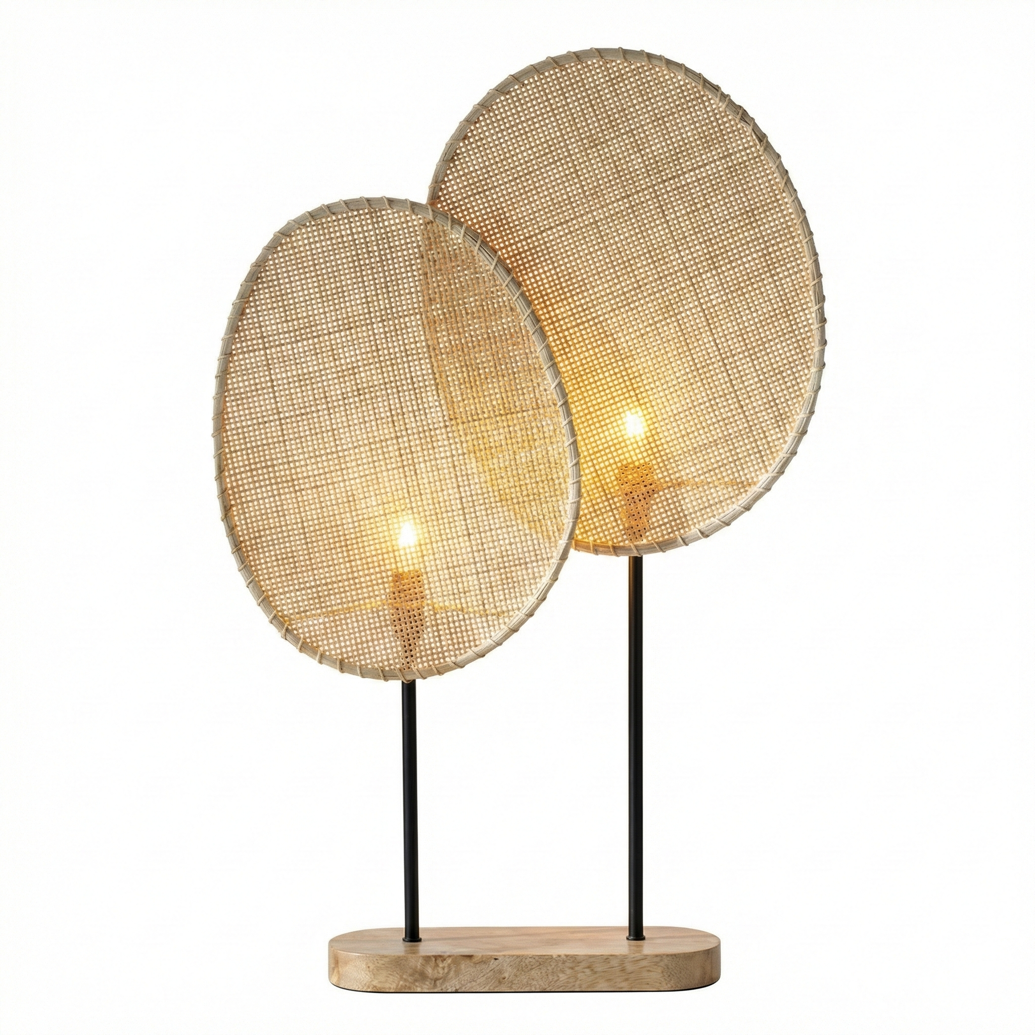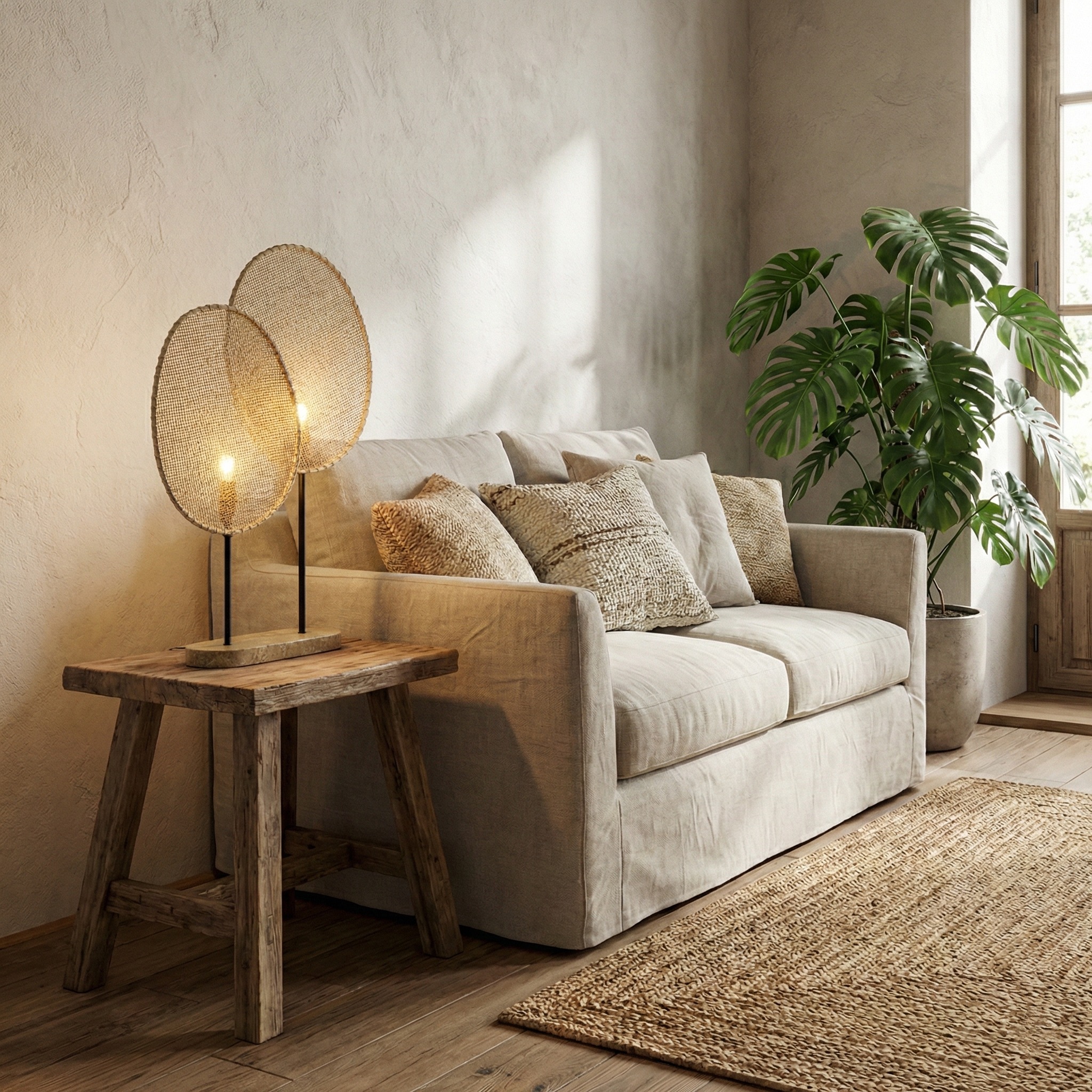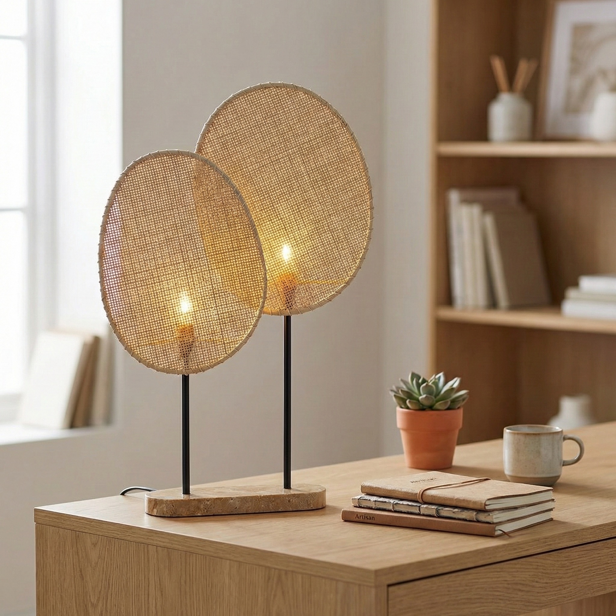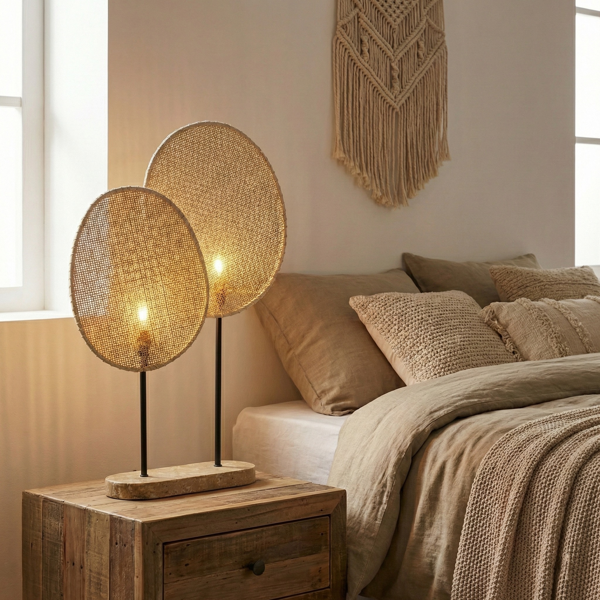 Su diseño se basa en la transparencia del tejido natural, que deja pasar una luz cálida y tamizada, ideal para jerarquizar un aparador en el living, una consola de entrada o como pieza protagónica en mesas de noche amplias. Es el equilibrio perfecto entre la calidez artesanal y la estructura moderna.