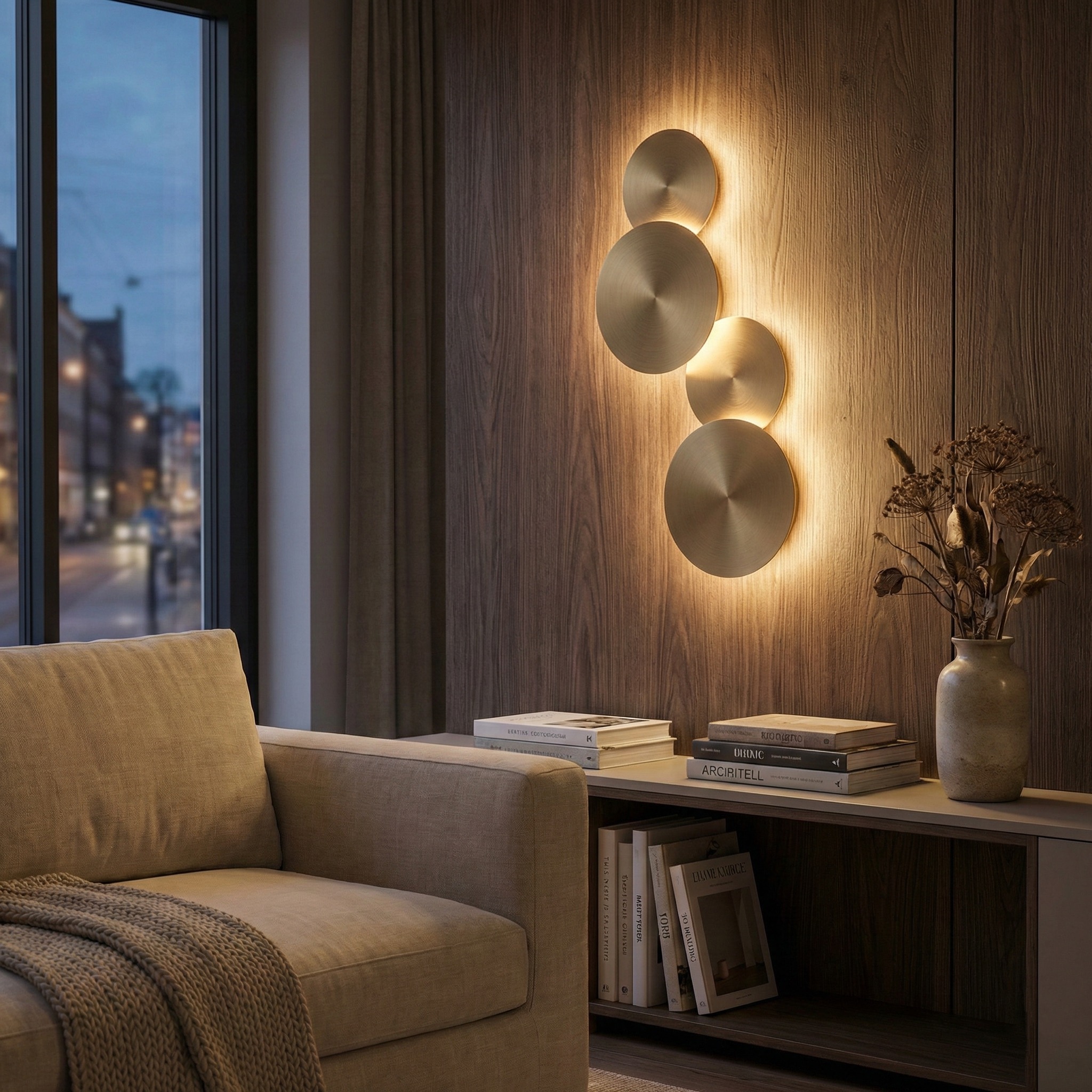 El Aplique “Eclipse Quad Wall” es una pieza de iluminación decorativa que transforma cualquier muro en una galería de arte contemporáneo. Se compone de cuatro discos circulares de diferentes diámetros, dispuestos en una composición orgánica y escalonada que oculta la fuente de luz. Al encenderse, cada disco genera un halo de luz perimetral suave, creando un efecto de profundidad y relieve sumamente elegante, ideal para pasillos de jerarquía, respaldos de cama modernos o como iluminación de acento en livings de diseño.