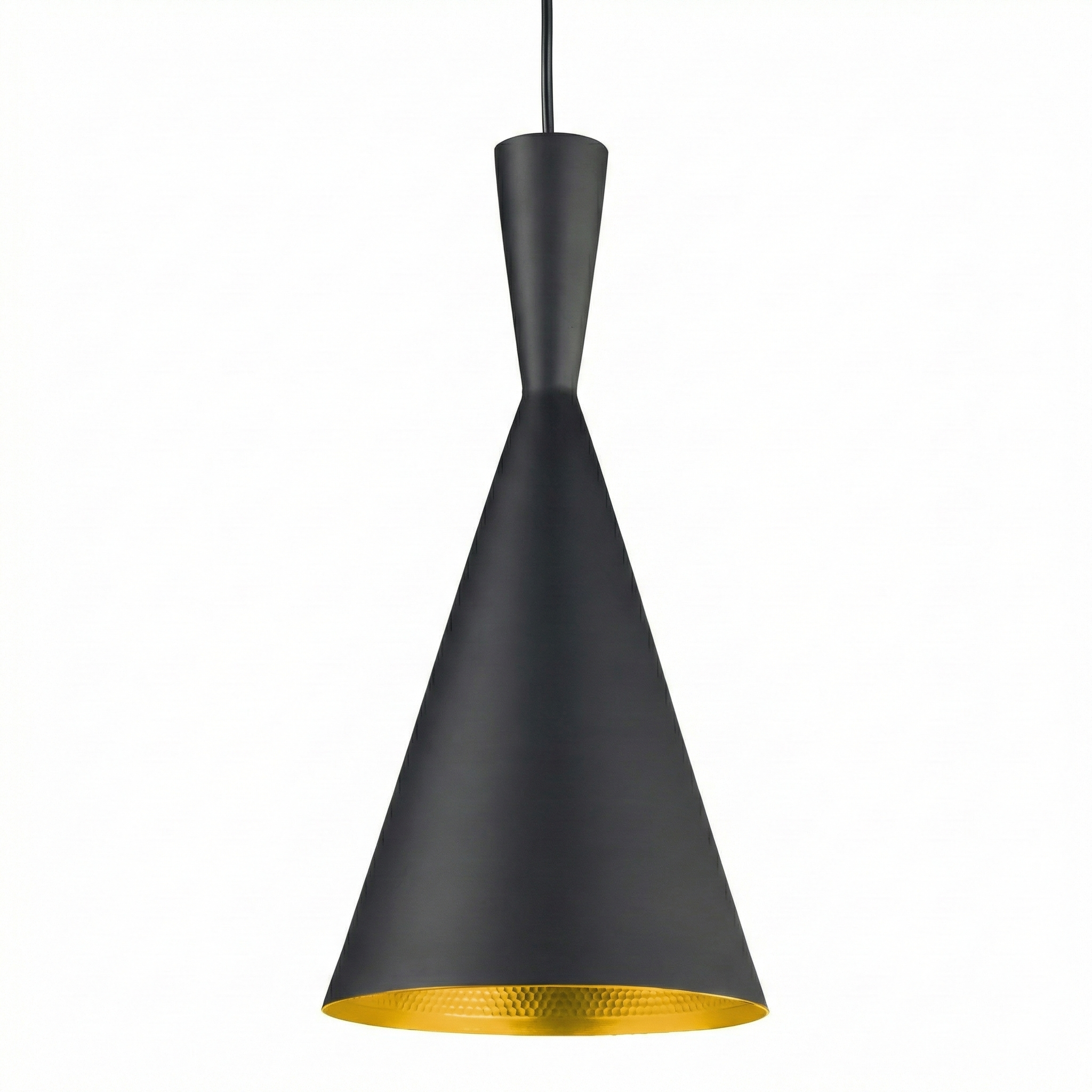 La Lámpara Colgante “Apex Gold” es una declaración de sofisticación y diseño contemporáneo. Su estructura exterior presenta un perfil cónico alargado y elegante en acabado negro mate, que se ensancha suavemente hacia la base. El verdadero protagonista es su interior: un baño de oro con acabado martillado que no solo aporta un contraste visual impactante, sino que también descompone la luz para crear una iluminación cálida, rica en texturas y extremadamente acogedora.