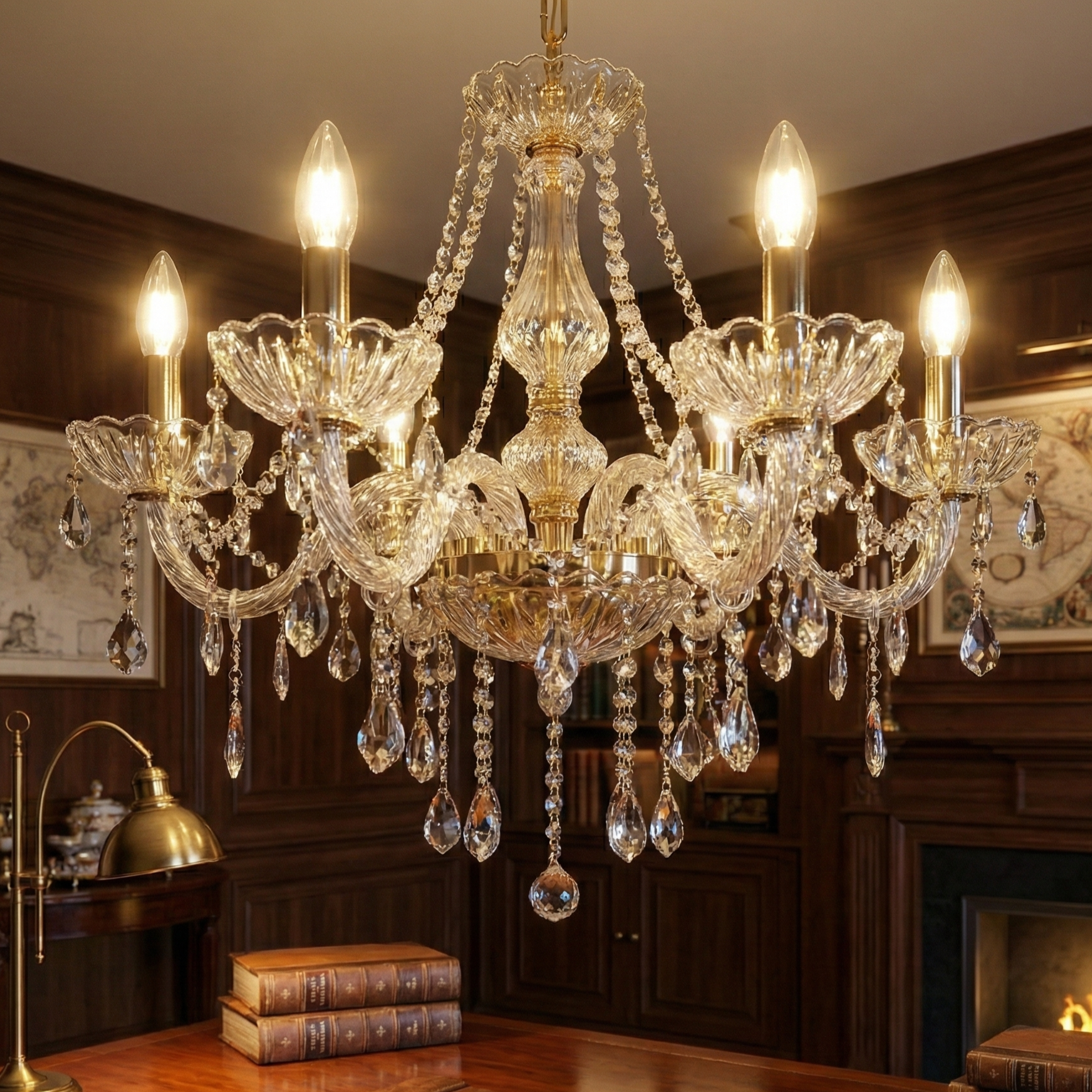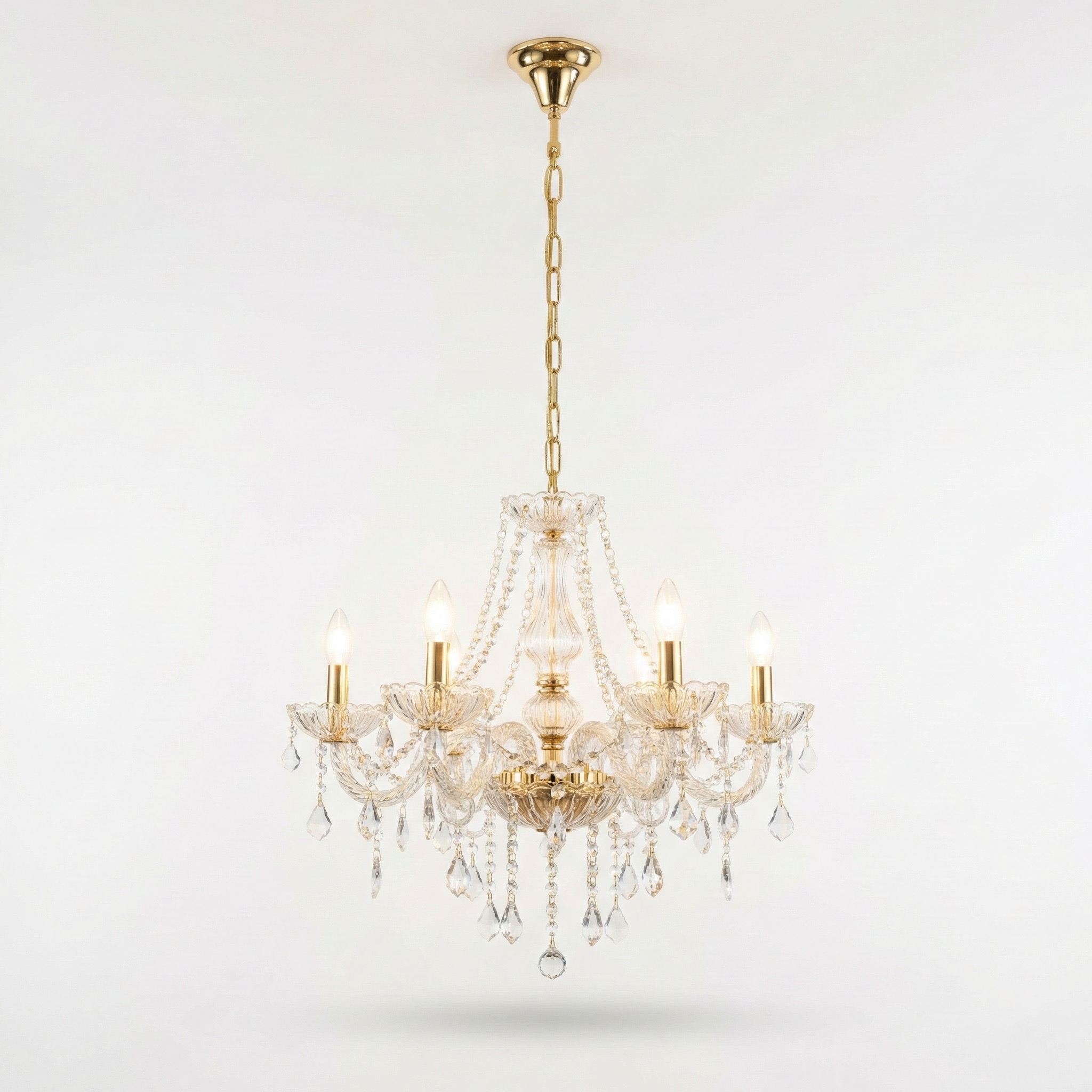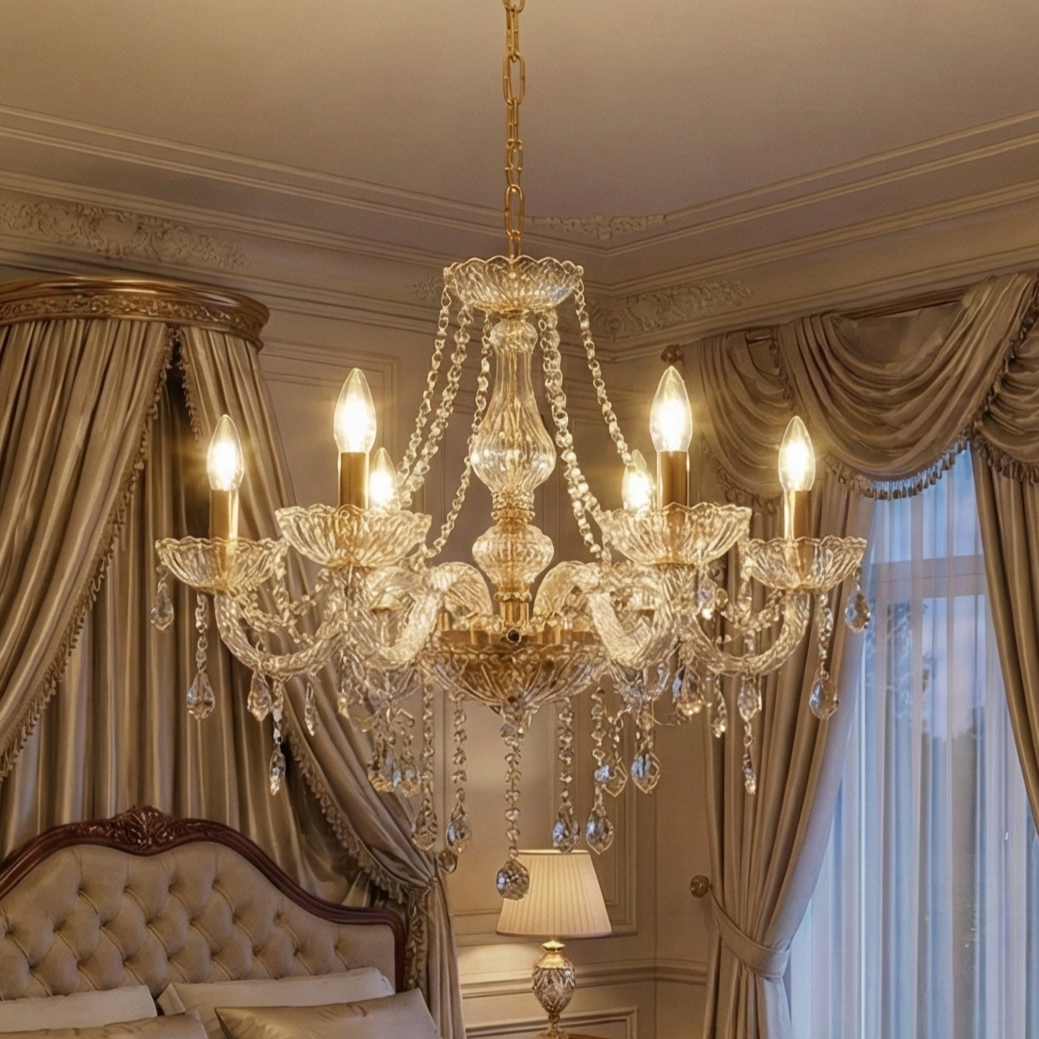 La Lámpara de Araña “Versalles” es una obra maestra del diseño clásico, concebida para ser la pieza central de los espacios más exclusivos. Esta luminaria de seis brazos combina una estructura metálica con acabado en oro pulido y una profusión de caireles de cristal tallado que capturan y descomponen la luz en un espectro deslumbrante.