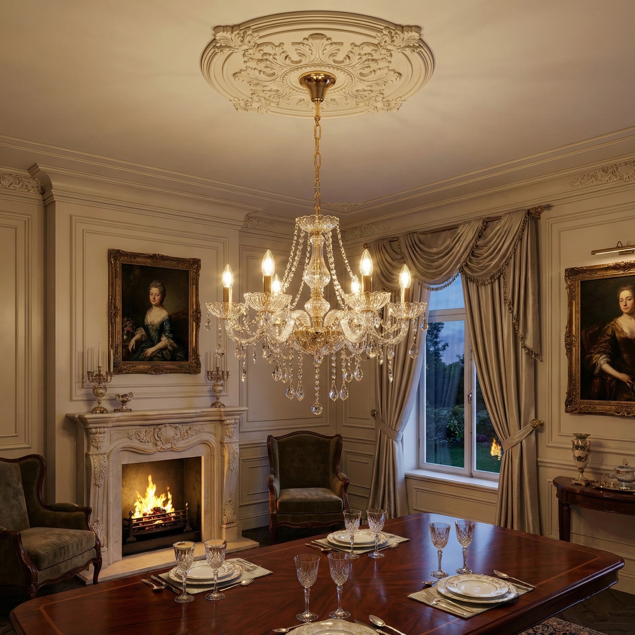 Cristalería de Alta Calidad: Caireles facetados que garantizan un brillo excepcional y reflejos prismáticos.