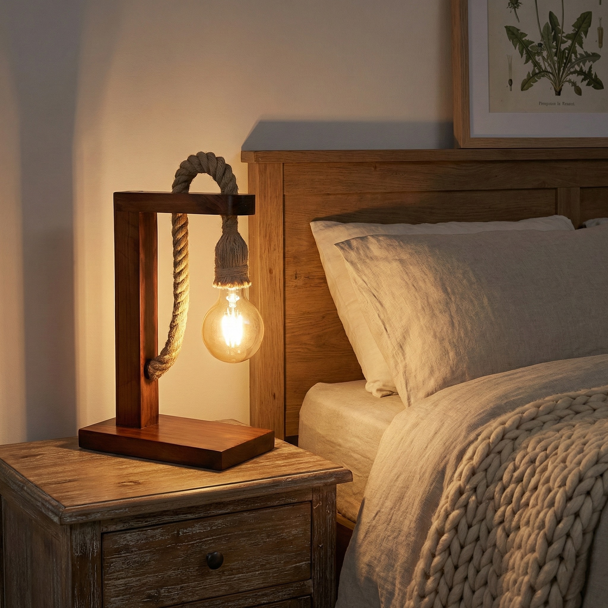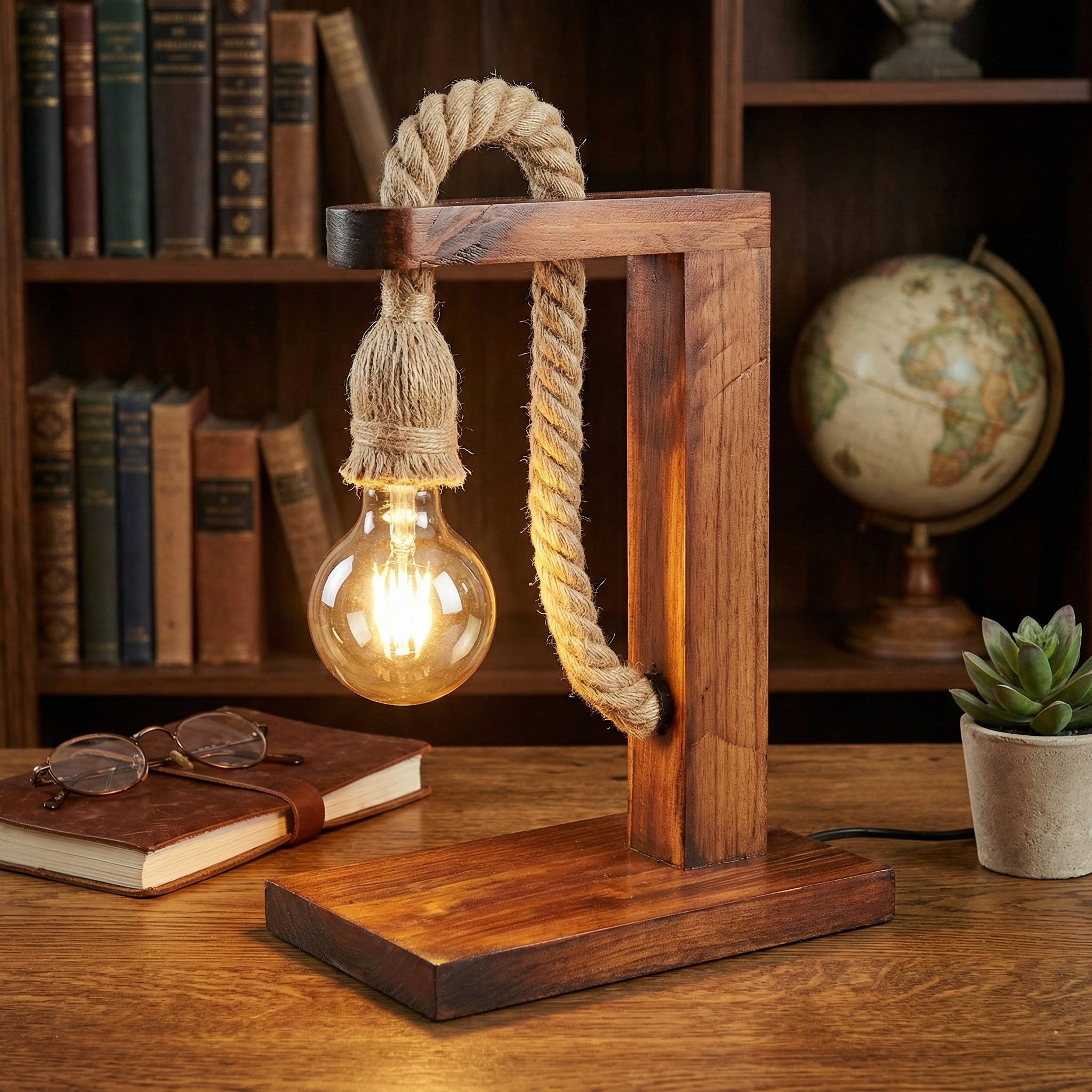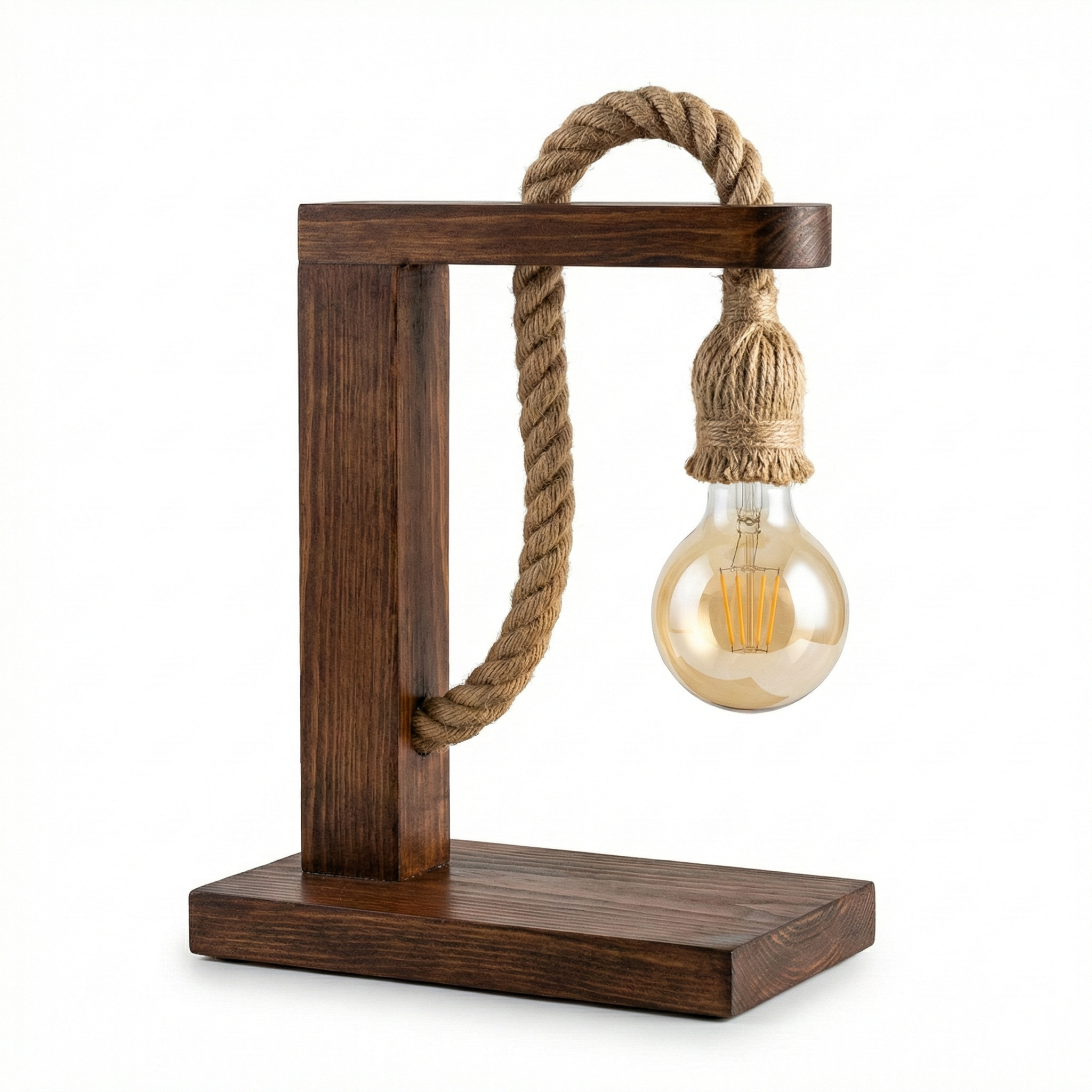 El elemento distintivo de este diseño es su cable revestido en soga de cáñamo, que atraviesa el brazo de madera para suspender una bombilla de filamento expuesta. Esta combinación de texturas —madera rugosa y fibra natural — crea una luminaria de estética industrial-vintage perfecta para quienes buscan un objeto con historia y calidez orgánica. Es el complemento ideal para escritorios de estilo rústico, mesas de noche con personalidad o estanterías de libros antiguos.