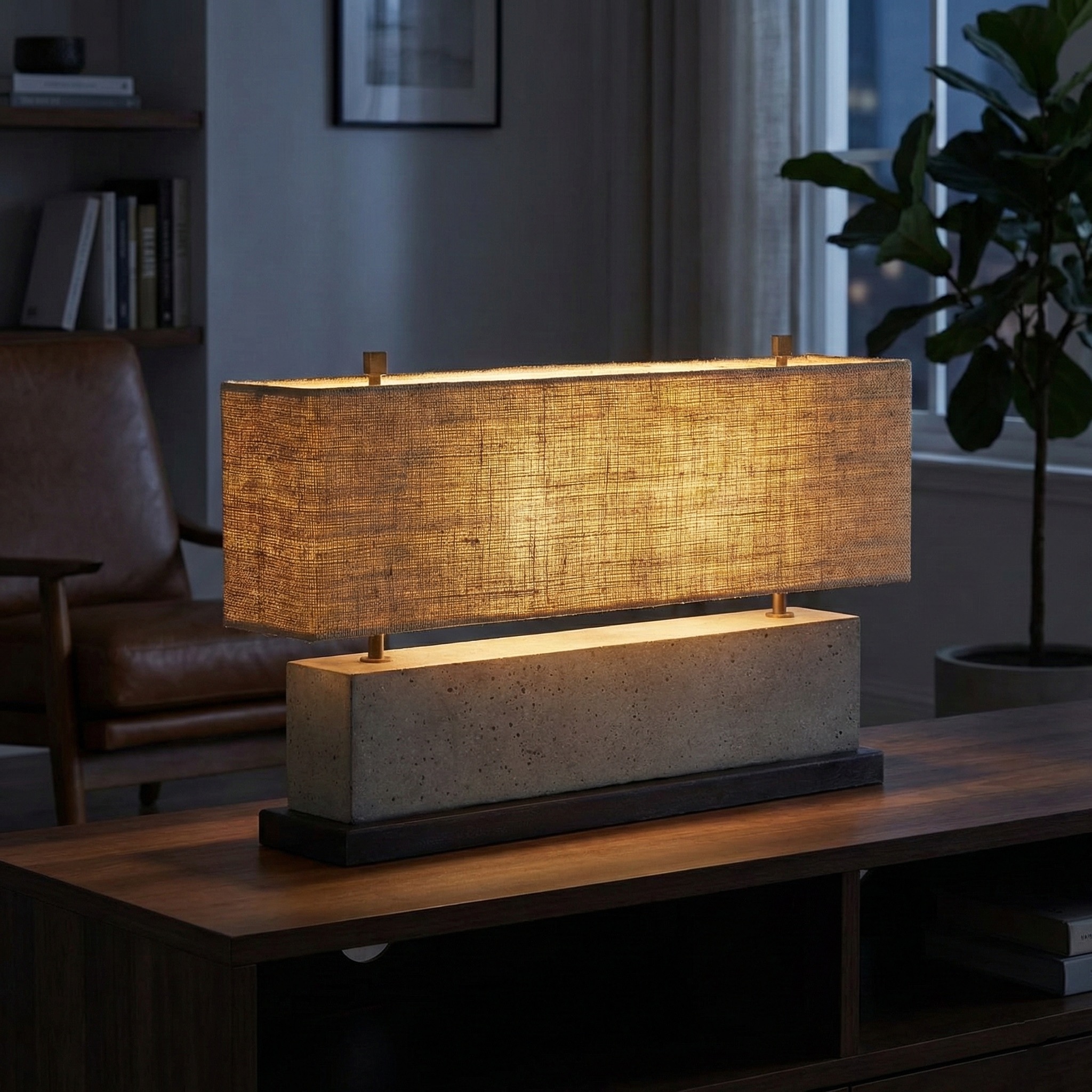 Su pantalla longitudinal, confeccionada en fibras naturales de trama abierta, se eleva sobre sutiles pilares metálicos, creando un contraste fascinante entre la pesadez de la base y la ligereza de la luz. Es la opción definitiva para jerarquizar aparadores de gran escala, consolas en recibidores o como pieza central en livings de diseño contemporáneo y minimalista.