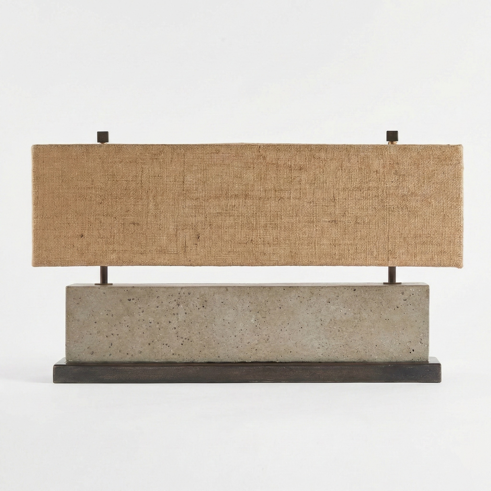 • Materiales: Base de cerámica/cemento técnico texturado, detalles en hierro bañado y pantalla de fibras naturales.