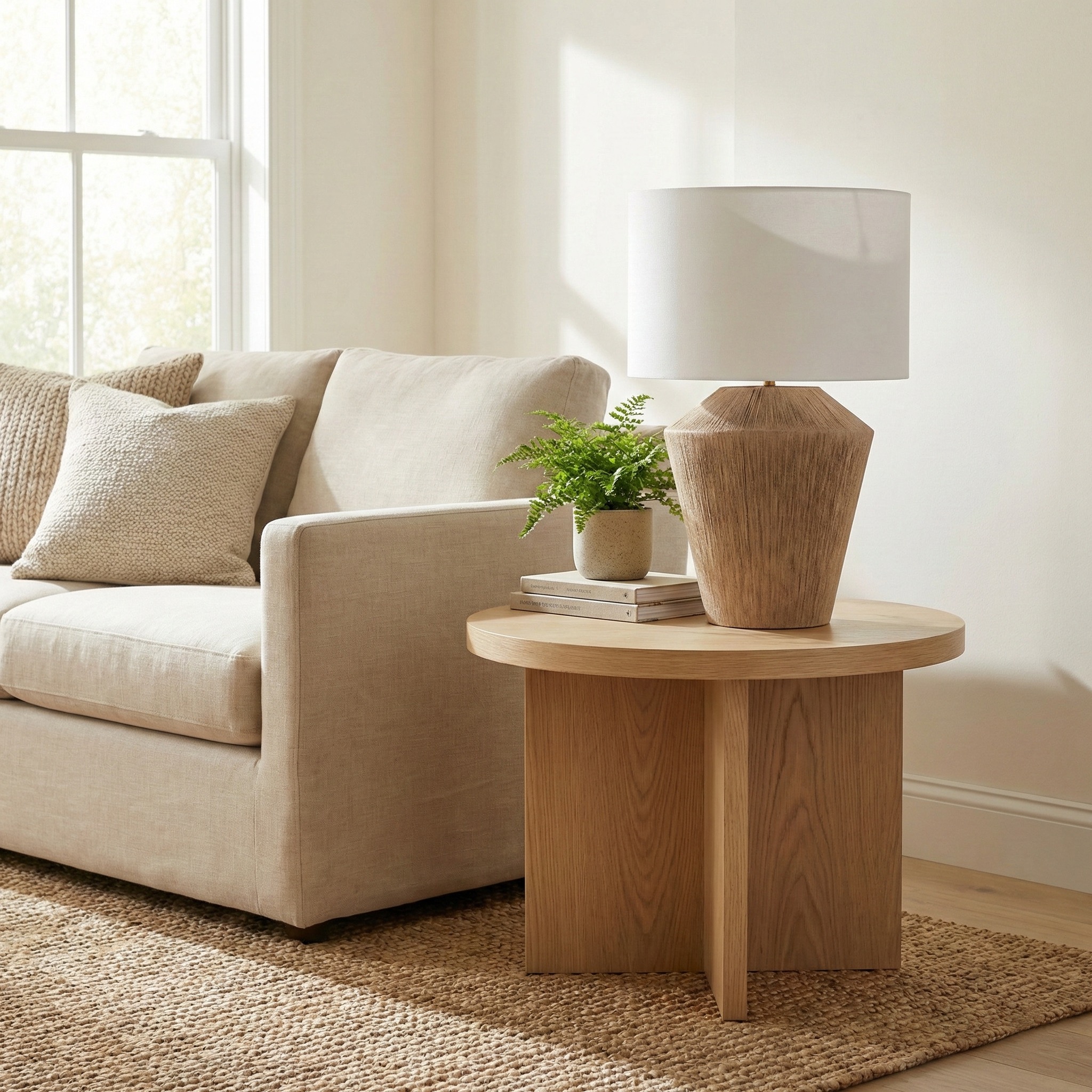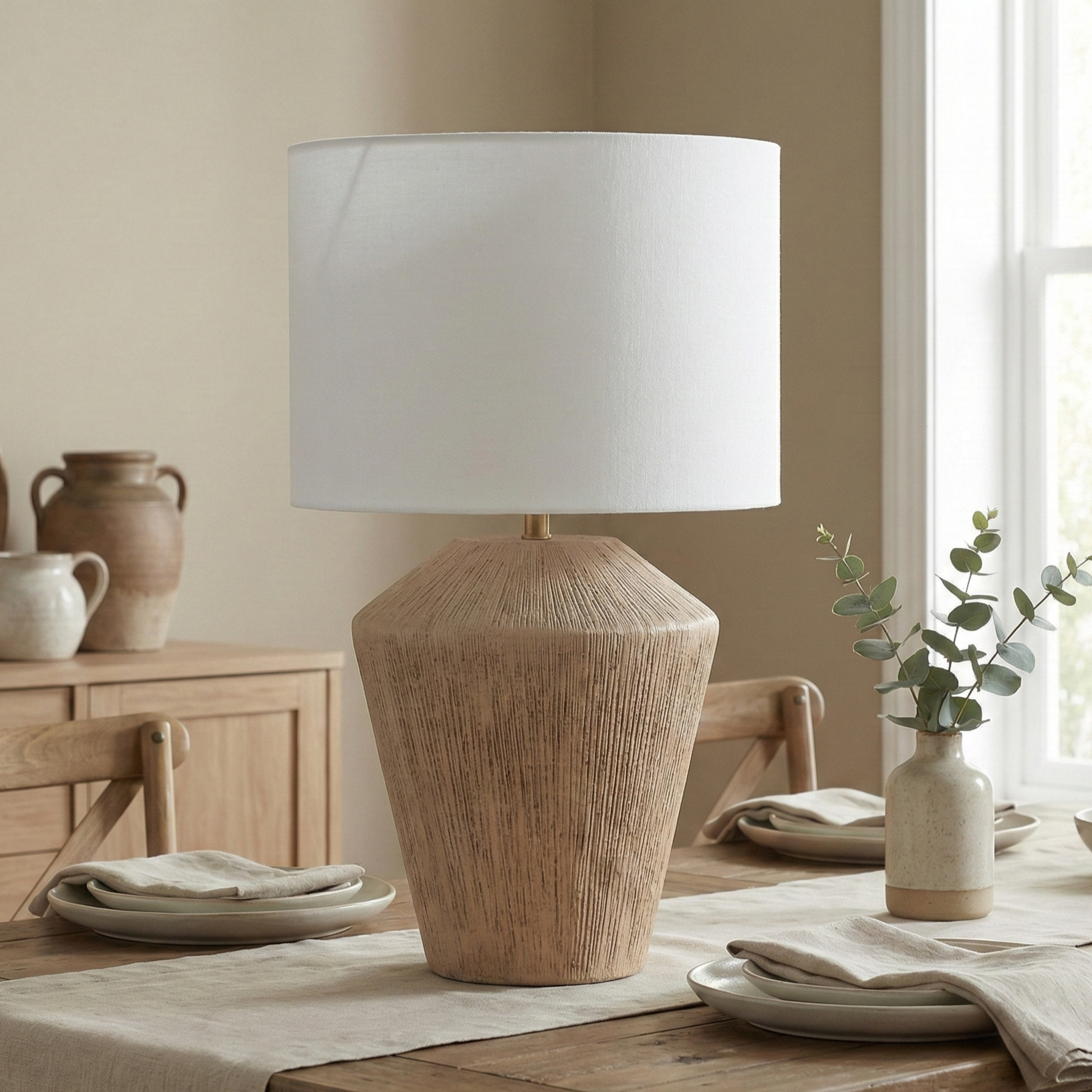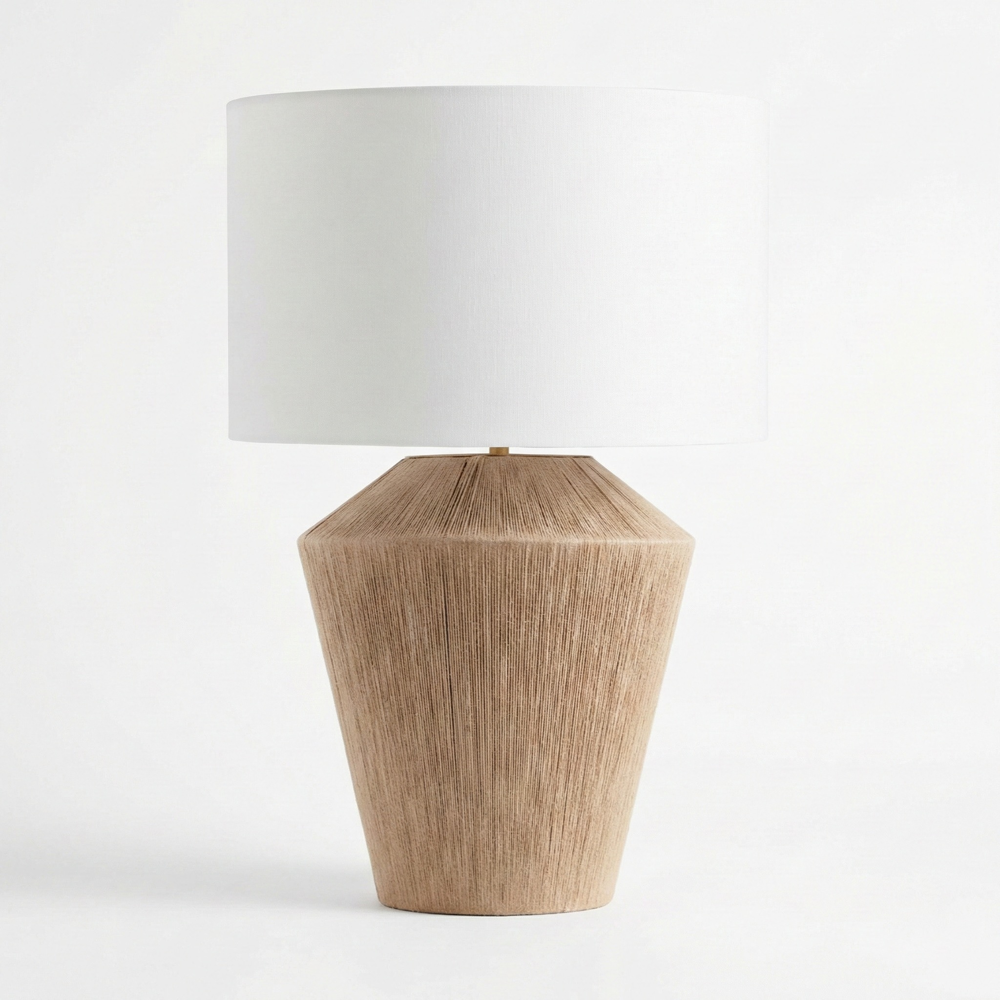 La Lámpara “Nativo Jute Cone” es una pieza que celebra la artesanía táctil y la simplicidad moderna. Su base cónica está íntegramente revestida en fibras de yute natural dispuestas de forma rítmica, aportando una calidez orgánica que invita al tacto. Coronada por una pantalla drum en tela de algodón blanco puro, esta luminaria es perfecta para aportar luminosidad y una estética Boho-Chic o Japandi a dormitorios y livings contemporáneos.