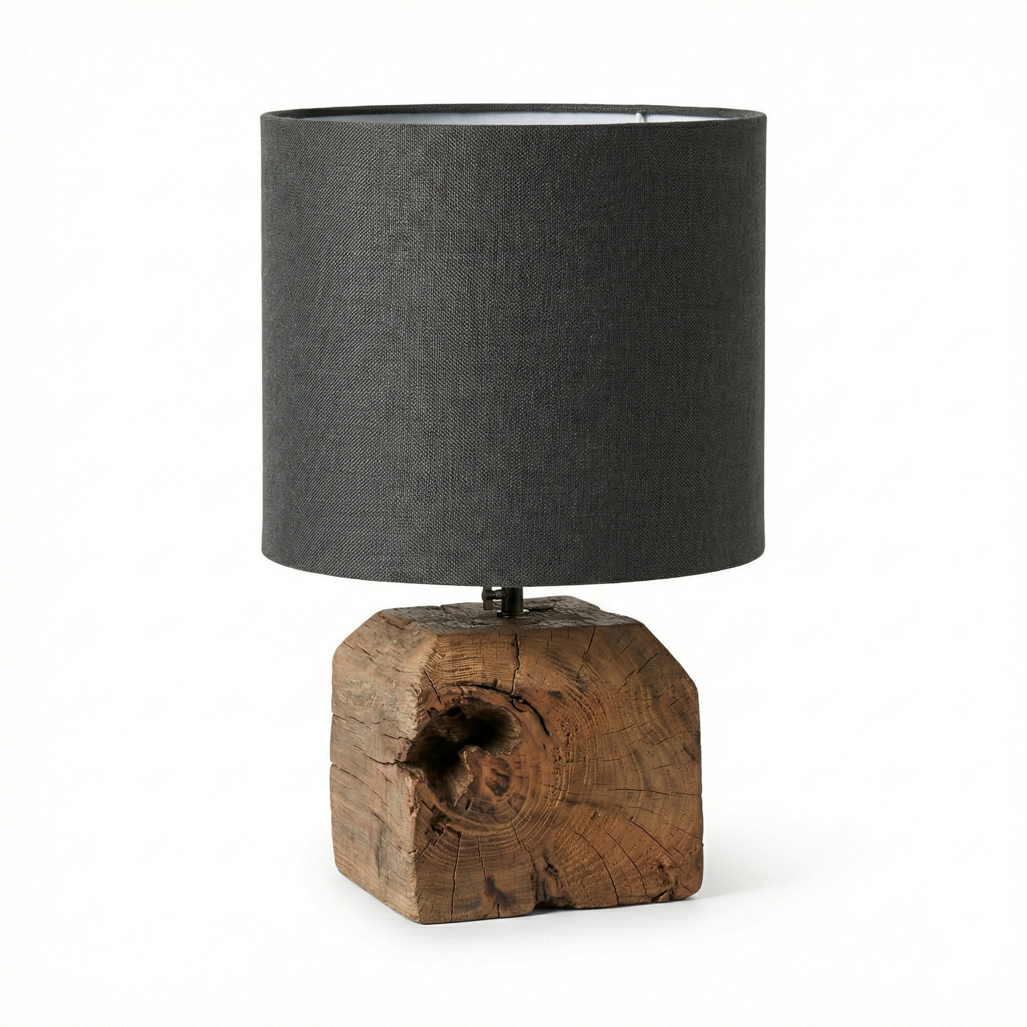 Contrastando con la rudeza de la base, su pantalla cilíndrica en tela de algodón de alta densidad en tono gris carbón aporta la cuota justa de modernidad y sofisticación. Es la luminaria perfecta para quienes buscan piezas con alma que cuenten una historia en livings, dormitorios o espacios de lectura con una impronta orgánica o rústico-industrial.