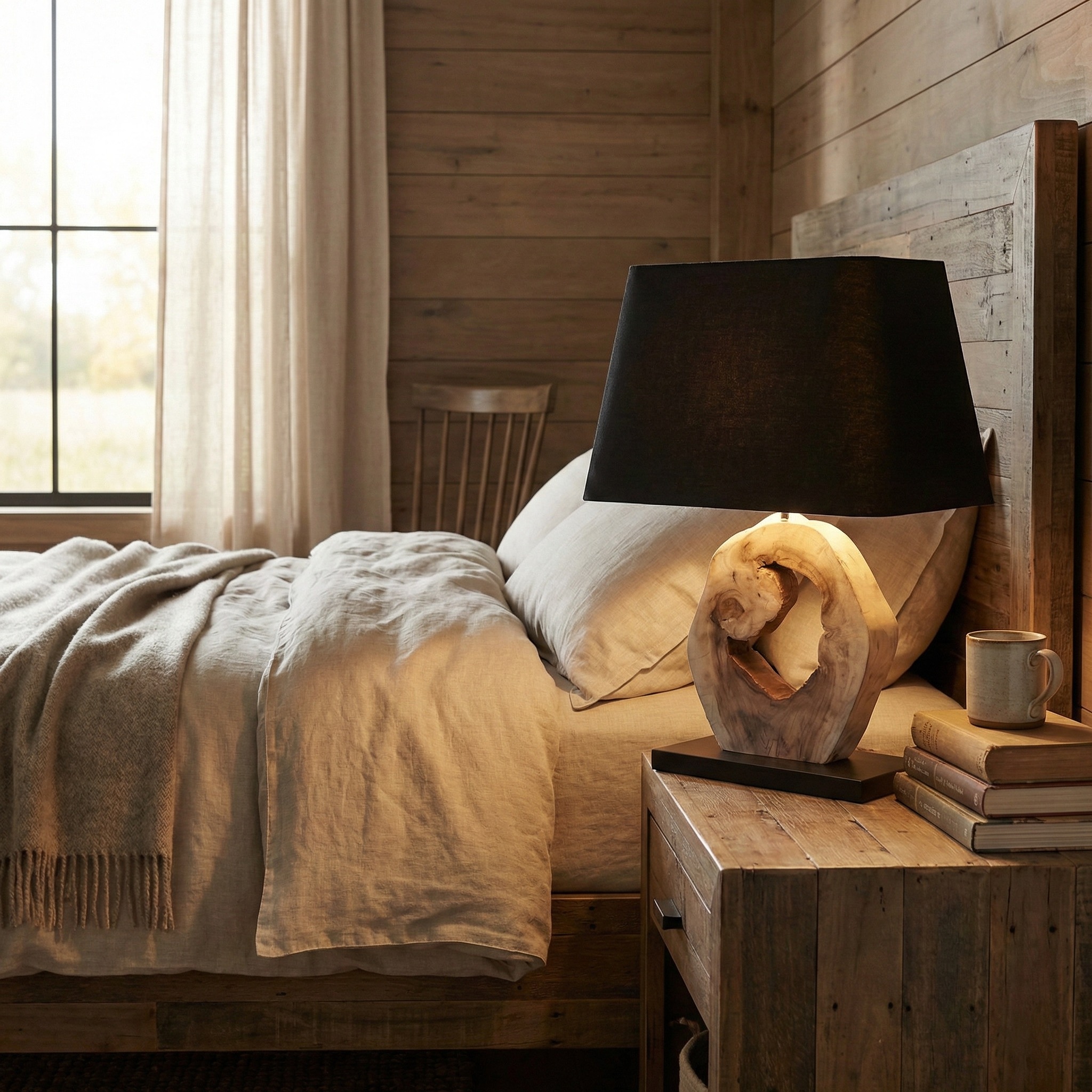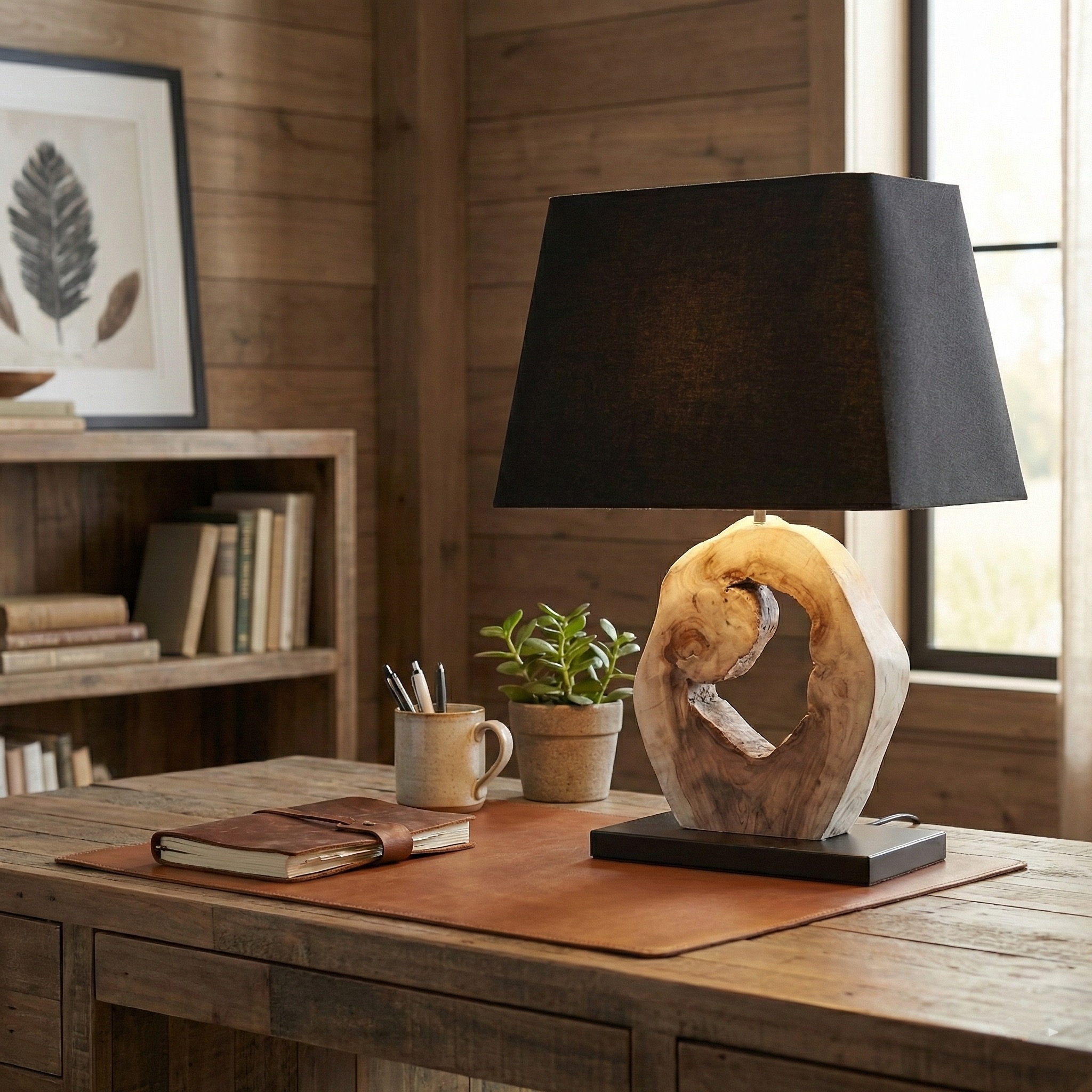 La Lámpara “Nativo Void Black” es una pieza de diseño de autor que captura la esencia de la naturaleza en un formato sofisticado. Su base es una sección transversal de madera maciza seleccionada por su apertura central orgánica, lo que convierte a cada lámpara en una escultura única e irrepetible. El contraste entre la calidez táctil de la madera y la sobriedad de la pantalla negra genera una presencia visual imponente, ideal para jerarquizar livings, oficinas o consolas de entrada.