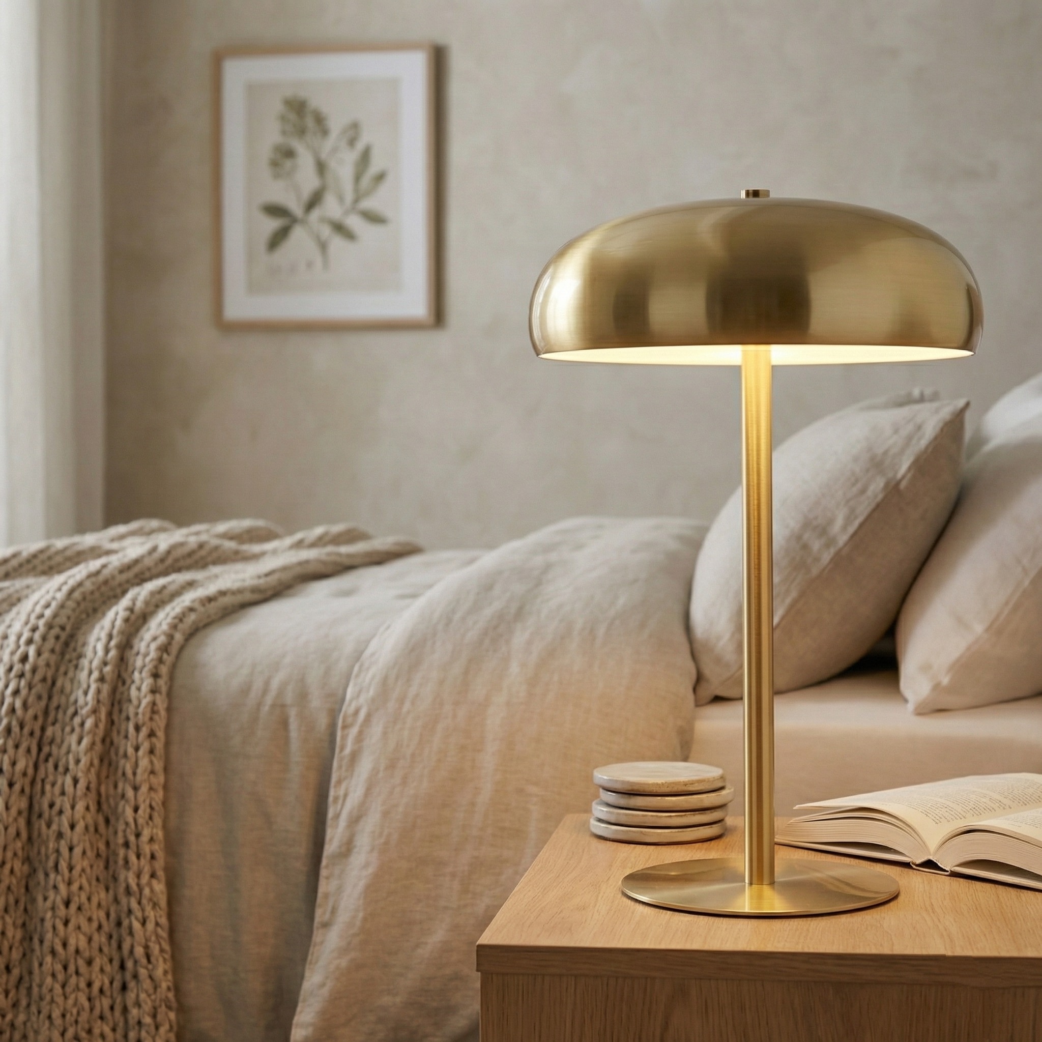 La Lámpara de Mesa “Nébula Gold” es la joya de nuestra colección Space Age. Esta versión eleva el icónico diseño de hongo mediante un acabado en oro satinado de gran profundidad, que no solo refleja el entorno con elegancia, sino que aporta una calidez cromática inigualable a la habitación.