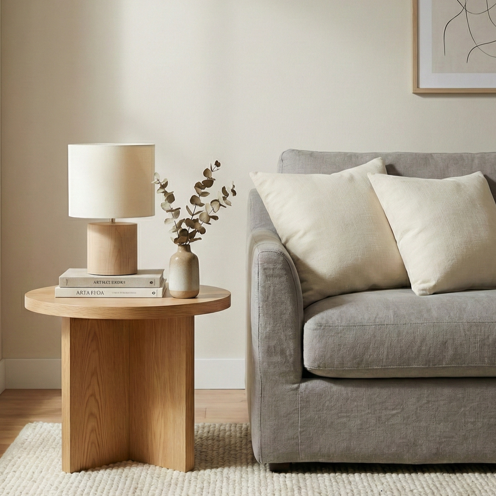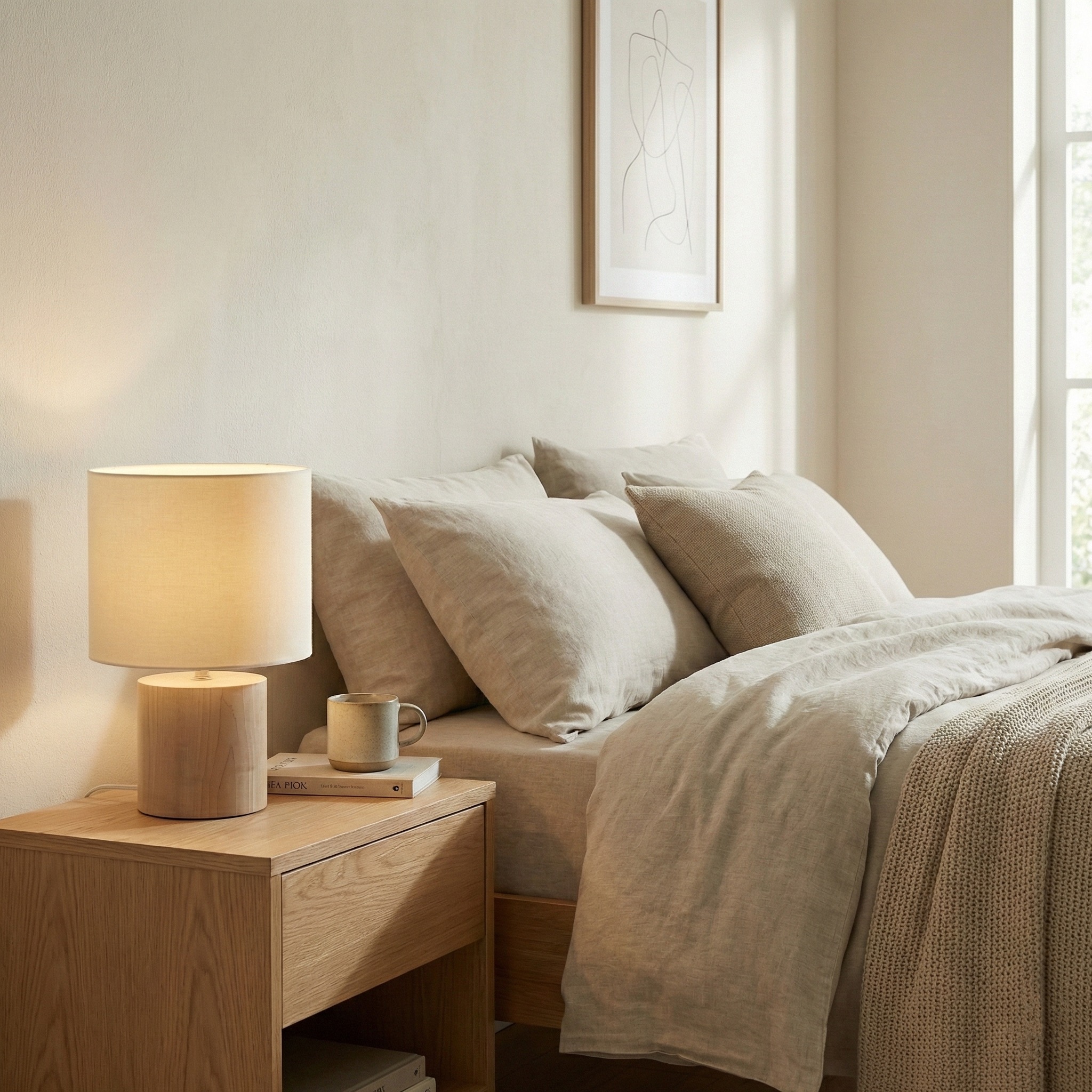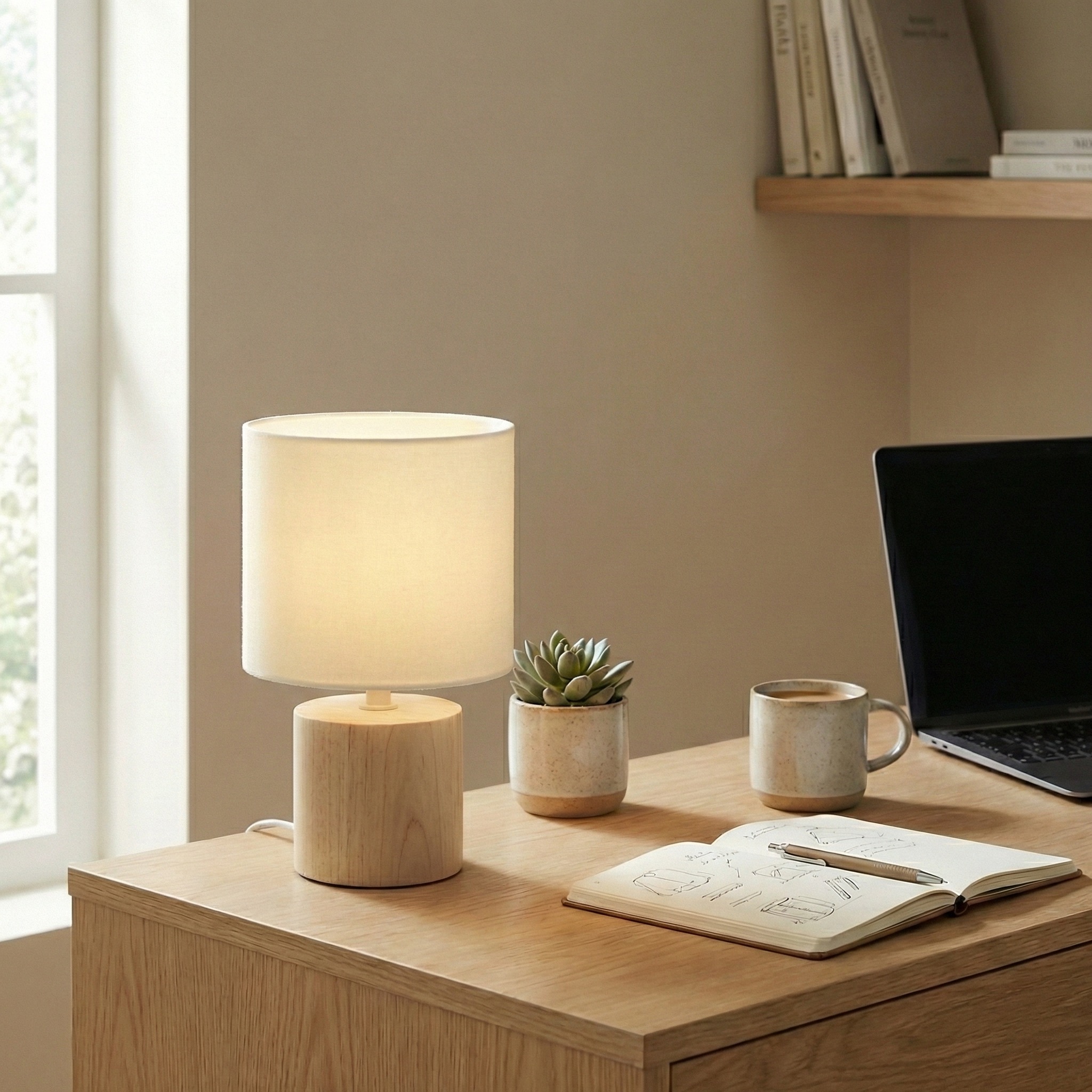 • La Lámpara “Nórdica Core” representa el minimalismo en su estado más puro. Su diseño se centra en una base cilíndrica perfecta de madera maciza de veta suave (Abedul o Arce), que aporta una luminosidad natural incluso apagada. Coronada por una pantalla tipo drum de gran porte en tela de algodón, esta pieza es ideal para quienes buscan una iluminación equilibrada y serena en mesas de noche, escritorios despejados o consolas de estilo contemporáneo.