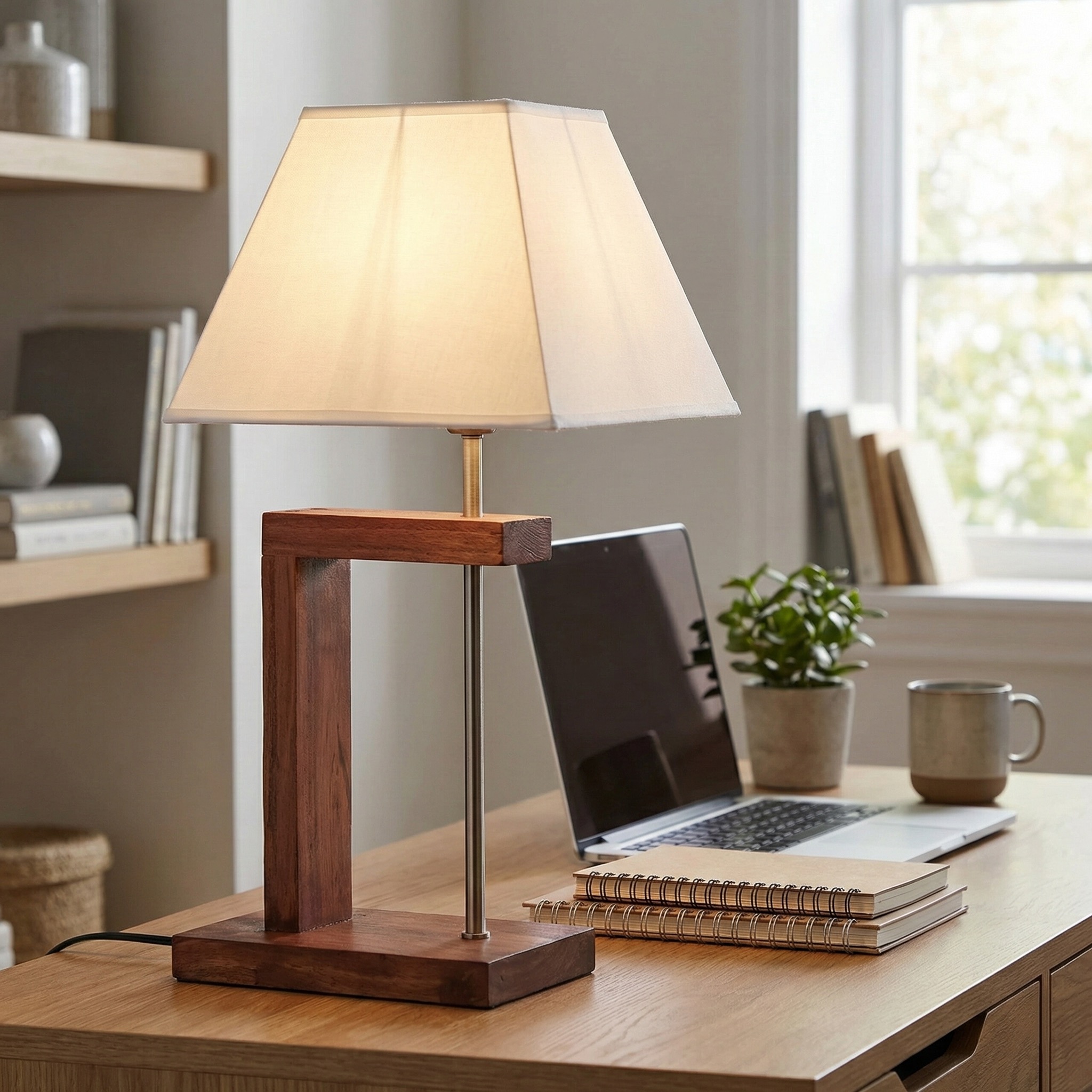 Sostenida por un sutil eje metálico, su pantalla textil blanca de forma trapezoidal equilibra la robustez de la madera con una difusión de luz suave y elegante. Es la elección perfecta para quienes buscan una luminaria con carácter escultórico que aporte calidez y sofisticación a escritorios de oficina, mesas de noche o consolas de recibidor.
