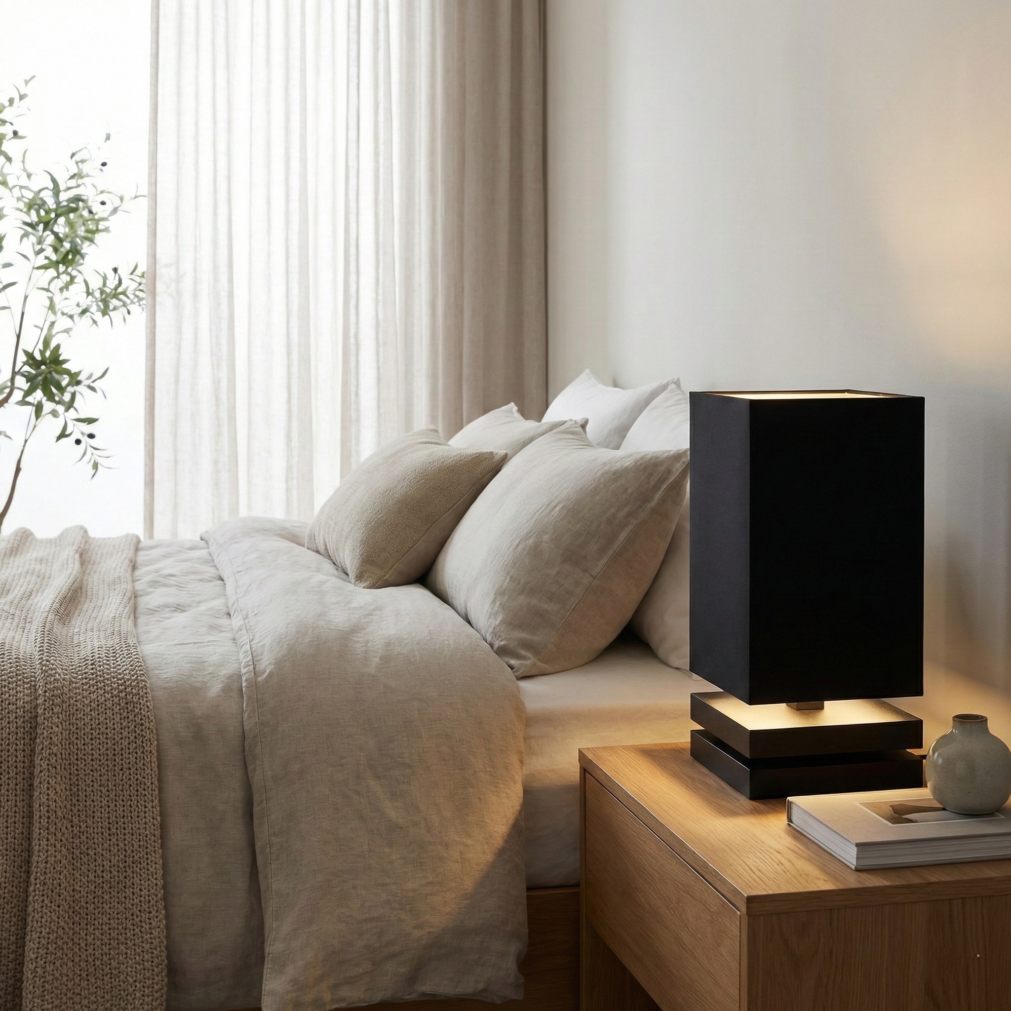 La Lámpara “Zenith Noir Slim” es la versión estilizada de nuestra línea de bloques, diseñada para espacios que requieren una presencia elegante sin ocupar gran superficie. De fabricación nacional, esta luminaria presenta una base compacta de dos bloques de madera maciza en negro mate, coronada por una pantalla rectangular alta que refuerza su verticalidad. Su estética “total black” la convierte en un objeto de diseño sofisticado, ideal para mesas de noche modernas, escritorios minimalistas o estanterías de autor.
