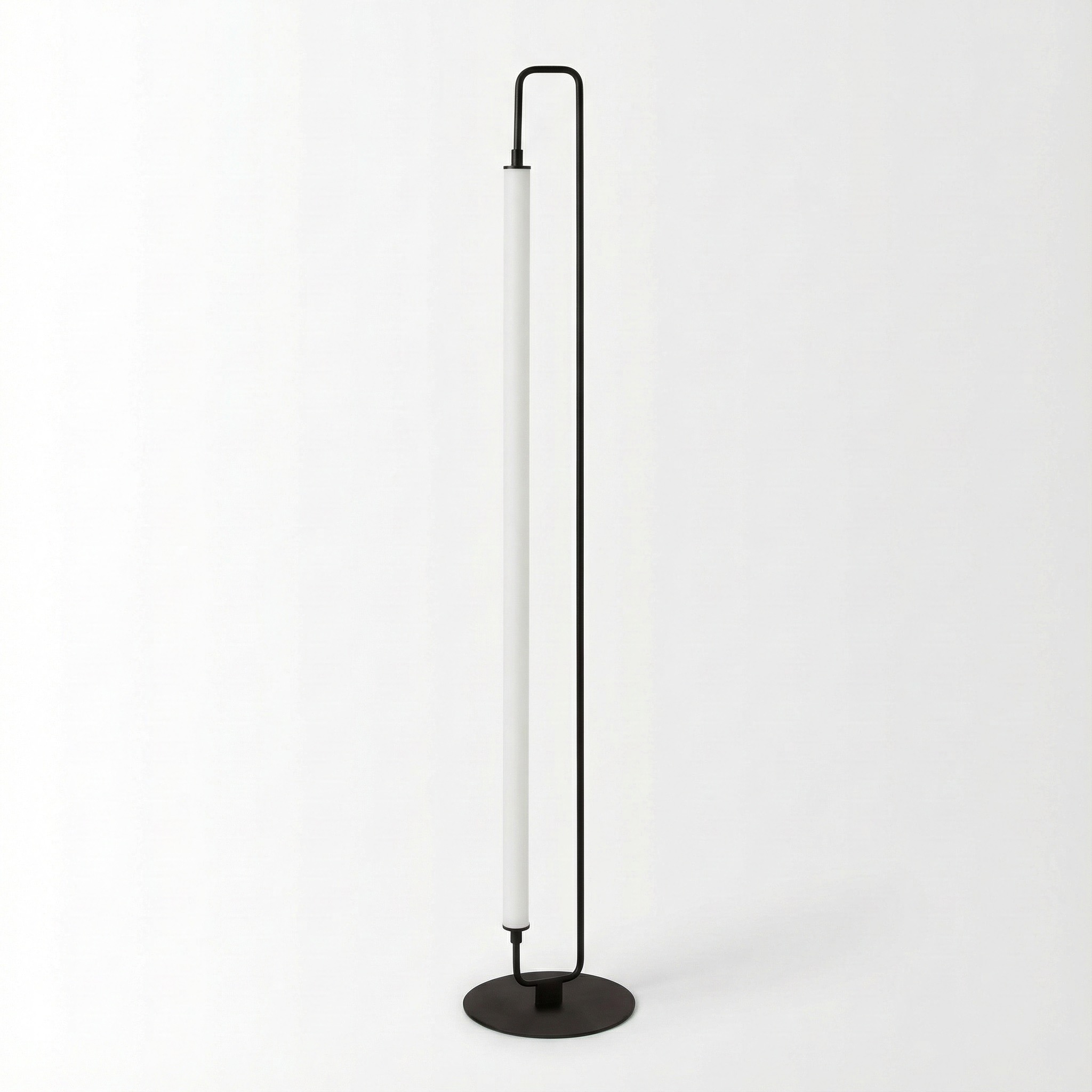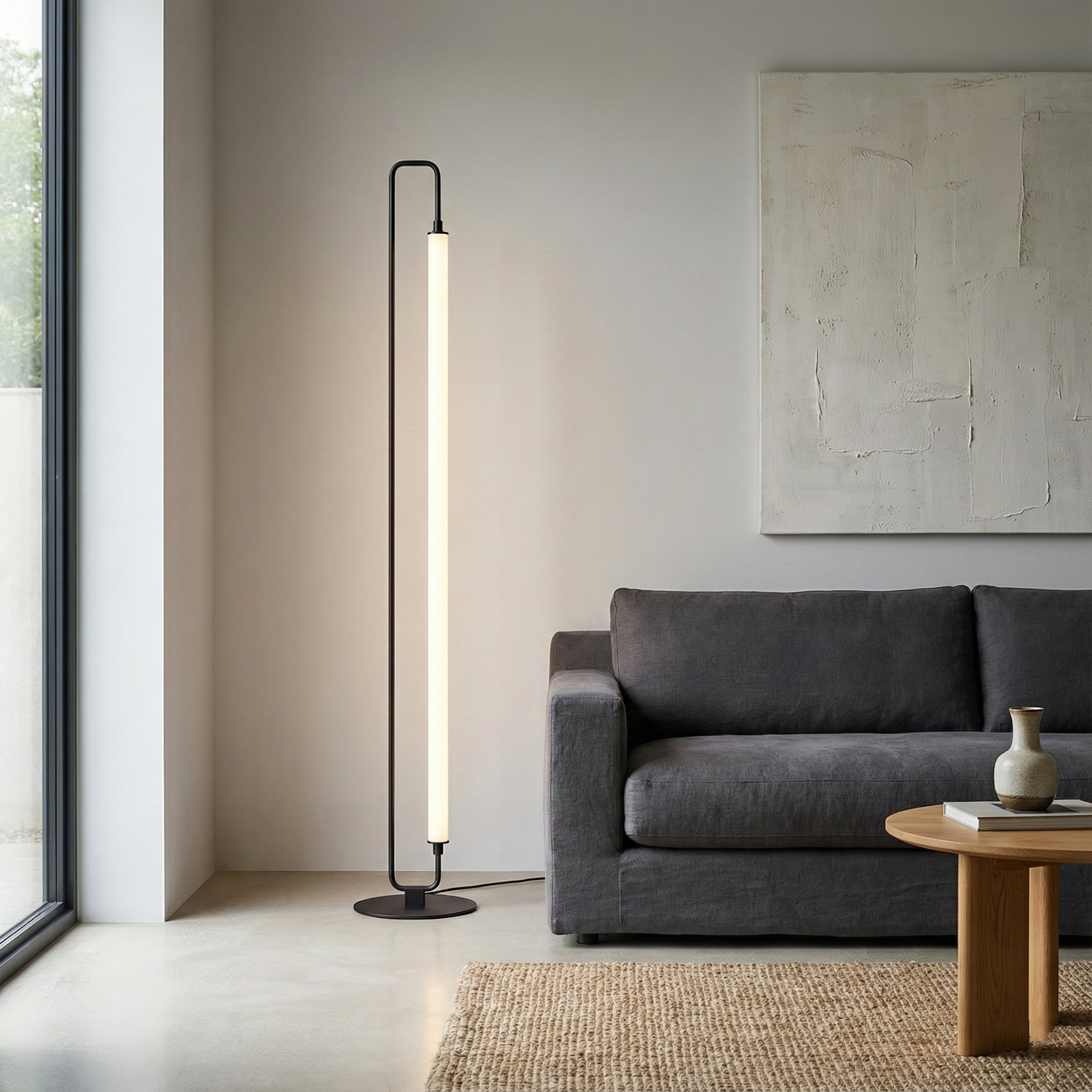 La Lámpara de Pie “Linearis” representa la síntesis perfecta entre arte lineal e iluminación funcional. Su diseño se compone de un marco metálico delgado en forma de “U” invertida que enmarca un potente tubo LED difusor. Esta configuración permite que la luz se proyecte de manera uniforme y suave, convirtiendo a la lámpara en una columna de luz que parece flotar sobre su base.