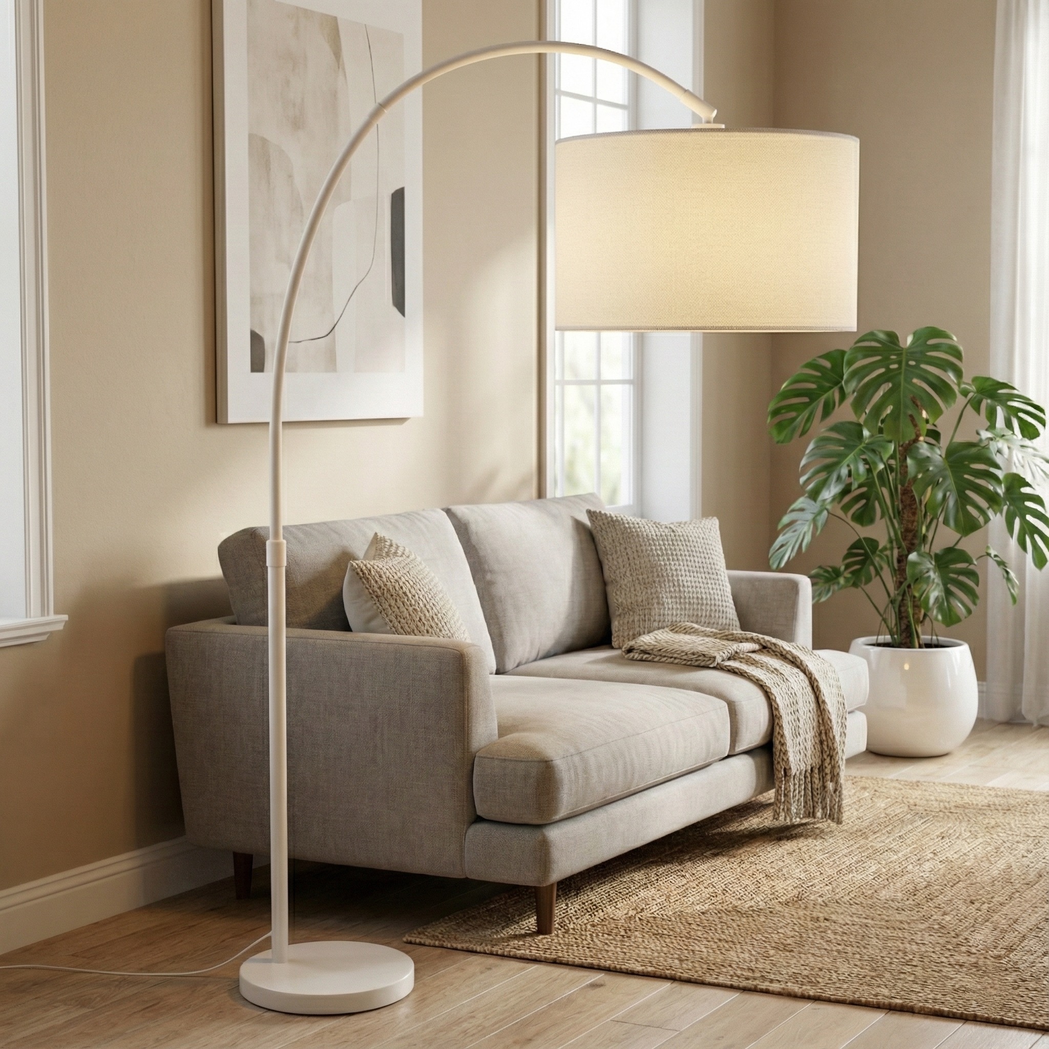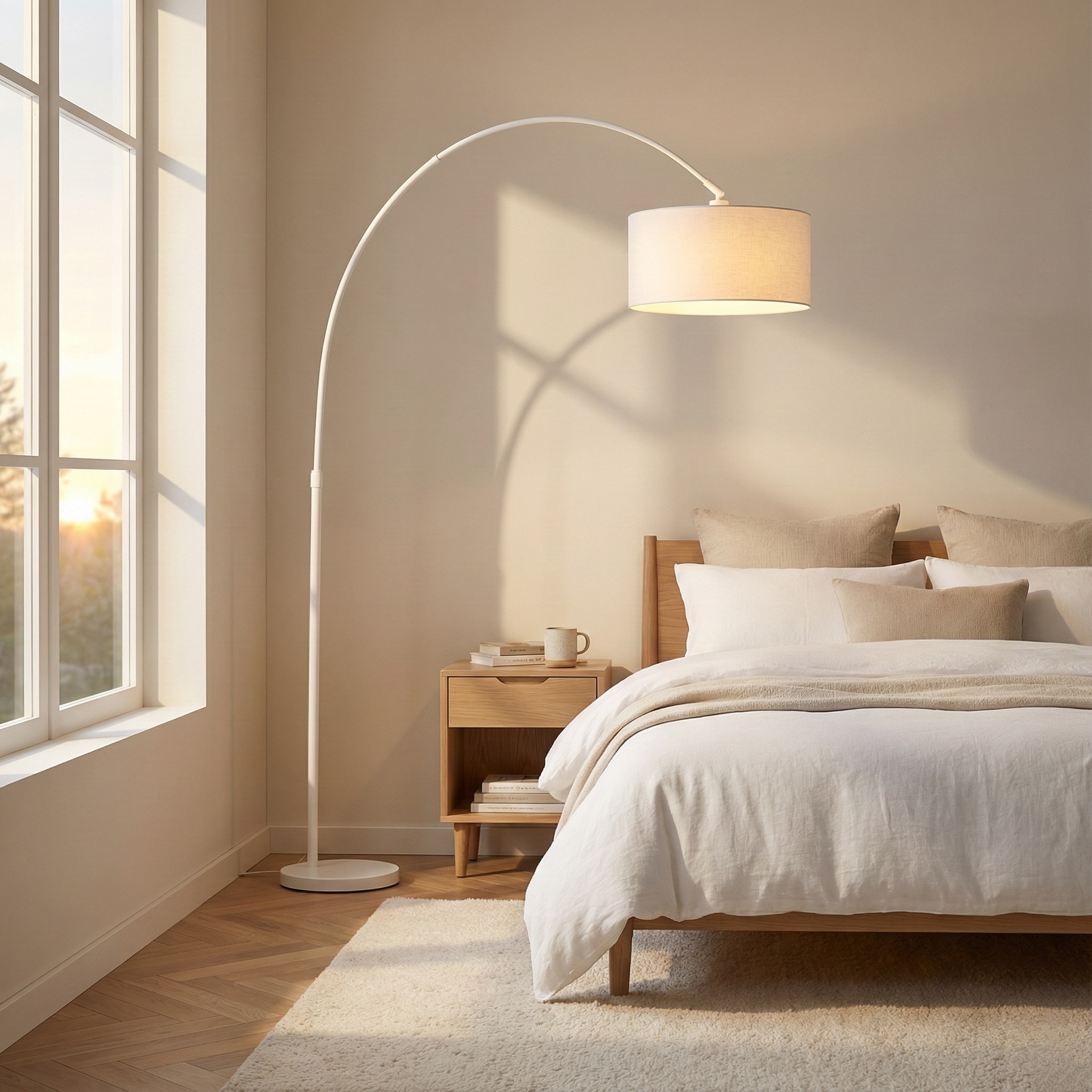 Luz Ambiental Cálida: La pantalla de tela difunde la luz uniformemente, ideal para salas de estar.
