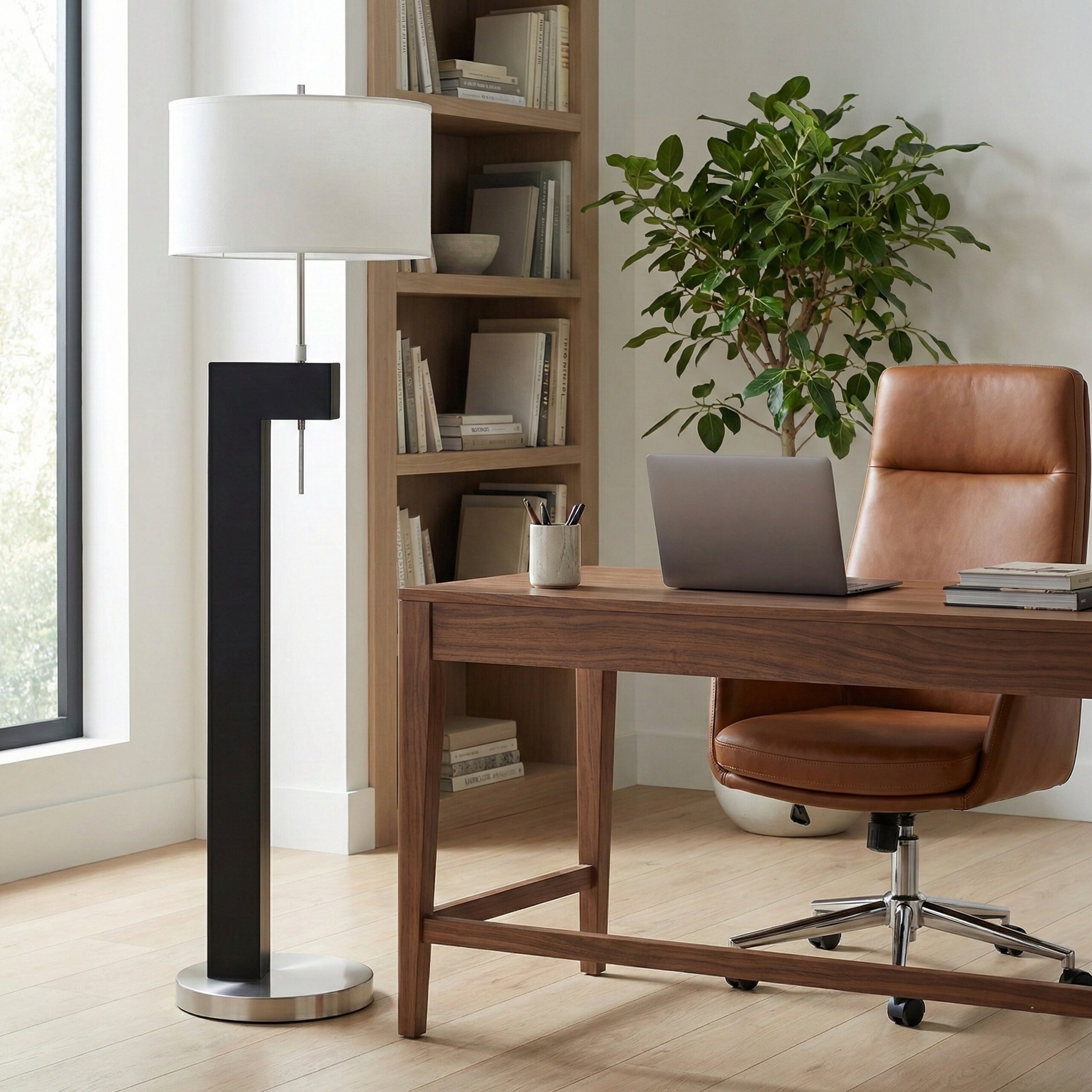 La Lámpara de Pie “Evo Column & Steel” es una pieza de diseño arquitectónico que redefine la elegancia moderna. Su estructura se basa en una sólida columna rectangular con acabado en negro mate que culmina en un ángulo de 90 grados para suspender con precisión su pantalla. El diseño se asienta sobre una base circular de acero cepillado que aporta un contraste industrial refinado y máxima estabilidad. Coronada por una pantalla cilíndrica de tela blanca de alta densidad y equipada con un clásico interruptor de cadena, esta luminaria es perfecta para ambientes ejecutivos, livings contemporáneos o suites de hotel que busquen una iluminación de gran porte y carácter.